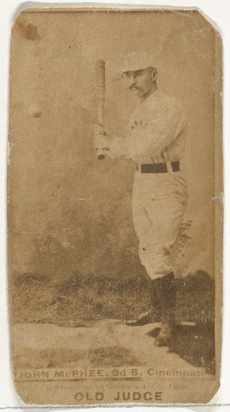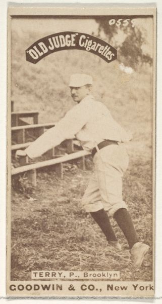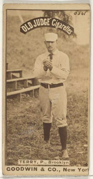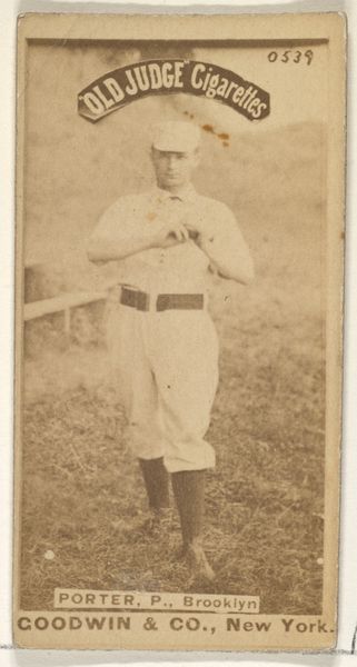 Editor: This is a baseball card, titled "Harkins, Pitcher, Brooklyn" made sometime between 1887 and 1890. It’s part of the Old Judge series of cigarette cards, so the artist is Goodwin & Company. What strikes me most is its functionality. These weren’t created as ‘high art’ but as ephemeral collectables. What do you see in this piece? Curator: As a materialist, I find it fascinating to consider the entire process. We have the photograph itself, reproduced as a print. But the key is that connection to the Old Judge Cigarettes brand. It becomes a means of distribution, intimately tied to the tobacco industry, the labor involved in that industry, and consumer culture. Consider also that these were intended to stiffen cigarette packs, a practical, utilitarian function preceding their collectible appeal. Editor: So you’re saying the image itself isn’t the primary focus, but the network of production and consumption that surrounds it? Curator: Precisely. Think about the access to photography required for these images at this time. The mass production indicates the evolving relationship of images to commerce and a burgeoning celebrity culture. These cards facilitated the branding of baseball players, the construction of their images as commodities for consumption. It reveals the broader social and economic context that created not just the image, but the entire phenomenon of baseball cards. Editor: That's a fascinating way to look at it. I always thought about them as just early examples of baseball memorabilia. Curator: It prompts the questions: what value do we assign to the player and to the photograph? Are they the same, and what can this early collectible, initially a tool for selling cigarettes, teach us about marketing, labor and American culture? Editor: This definitely changed the way I view this piece. Seeing it as a confluence of industry, sport, and consumption provides much greater meaning. Curator: Indeed. And through this approach, these cards can provide surprising historical insights beyond just their surface-level depiction of a baseball player.
