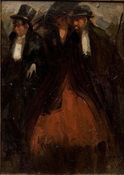 Curator: Standing before us, painted in 1902 by Edwin Austin Abbey, we have "Goneril and Regan, King Lear, Act I, Scene I," rendered in oil. Editor: The faces… They have a certain chill. It’s more than just their expressions. It's in the colors. The red dress of Goneril practically vibrates with suppressed malice. It gives me the shivers. Curator: Abbey, in this depiction, clearly portrays them as powerful figures, almost looming. Think about Shakespeare's text. Goneril and Regan embody ruthless ambition, willing to flatter their father to gain power. Editor: And they certainly exude a kind of entitlement here. The artist makes striking choices in terms of their presentation; jewels, regal clothing, their unblinking stares…they hold themselves with chilling confidence. This is an Edwardian interpretation of the sisters as archetypes of dangerous women. I can see echoes of femme fatales who appear throughout the Symbolist movement at the time the painting was created. Curator: Precisely! Abbey masterfully suggests their cruelty through composition and coloring. Goneril, especially, she looks almost ghostly against the soft backdrop, as if she haunts the very room she occupies. Did you also note how they are physically close, almost intimate? But somehow the emotional space is wide, empty. Editor: Yes! An observation well-made. There's this tight proximity that doesn’t read as intimacy but more like strategic alignment. The slight contrast of each sister in the other's shadow also conveys the dynamic of rivalry and cooperation, the sisterly bond pushed towards evil... it feels incredibly tense! Curator: I suppose Abbey really invites us to imagine the mindset of these women. A mindset where filial piety and genuine affection take a backseat to personal ambition. Editor: It's interesting how this one image holds such complex human emotions. Perhaps that’s the lasting legacy of Shakespeare, in combination with Abbey’s technical facility as an artist! Curator: It gives new life to this Shakespearean villain. Editor: The painting serves as a potent reminder that unchecked ambition and betrayal can wear the guise of royal elegance.