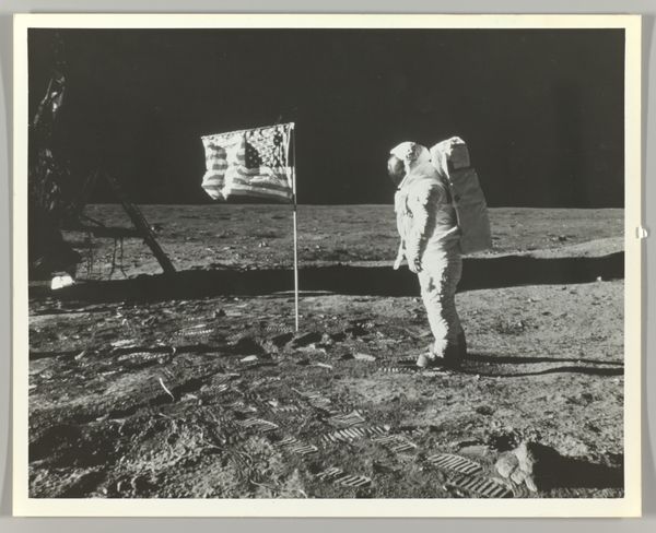 Editor: Here we have "Buzz Aldrin on the Moon with Components of the Early Apollo Scientific Experiments Package," a gelatin silver print, created between 1964 and 1974, currently housed at the Met. It’s a rather stark image; the grey scale gives it this sense of timelessness. What do you see in this piece, looking at it from a historical perspective? Curator: I see the apex of a socio-political ambition, perfectly captured. The space race was a proxy war, wasn't it? A battle played out not on Earth, but beyond it, fueled by Cold War anxieties and nationalistic fervor. This image isn’t just about scientific progress; it’s about demonstrating ideological supremacy, look at that flag. Editor: So, it's less about the moon landing itself, and more about what it represented at the time? Curator: Precisely. Think about the cultural impact. Space exploration permeated popular culture – music, film, fashion – shaping our collective imagination. The image itself became an instant icon, reproduced endlessly and reinforcing the narrative of American exceptionalism. How do you think its message endures today? Editor: That’s interesting. I hadn't considered the underlying message beyond just exploration and scientific achievement. It’s amazing how much history is embedded in this photograph. Curator: Indeed. Images like this aren't just records; they actively participate in shaping historical narratives and influencing public perception. Editor: It’s fascinating to consider how a photograph can carry so much weight and meaning beyond its literal depiction. Thanks, this gave me a fresh look at photojournalism in the 60’s and 70’s.