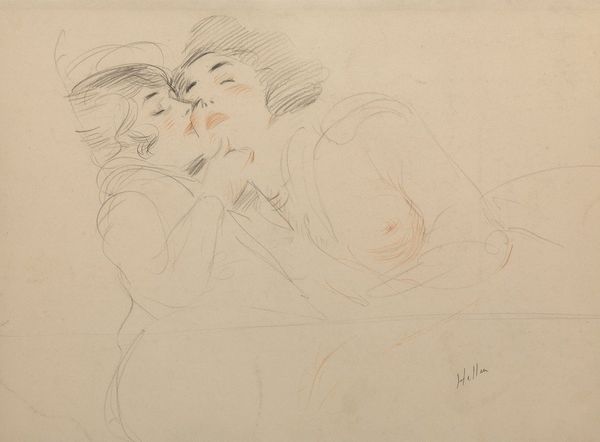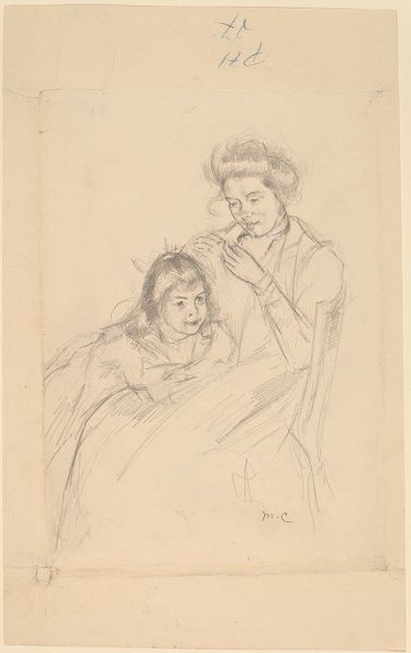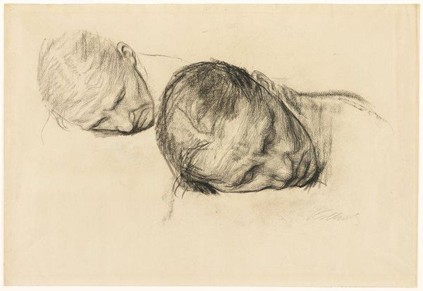 Curator: Lovis Corinth's drawing, "Mother and Child," captures such a tender moment with so few lines. Editor: It feels ephemeral, almost like a memory surfacing. The sketchiness gives it an intimate, personal touch. Curator: Corinth made this in 1909. It's interesting to consider how social expectations of motherhood might have influenced his portrayal, versus say, a modern artist tackling the same theme. Editor: Absolutely. And yet, it transcends a specific era, doesn't it? The universality of that bond is still so present. The quick strokes almost mimic the flurry of new motherhood. Curator: I agree. Corinth's ability to convey such a profound connection with minimal detail is truly remarkable. It invites contemplation on the many facets of motherhood. Editor: It's a dance of light and shadow, emotion and form, isn't it? It will stay with me.