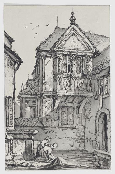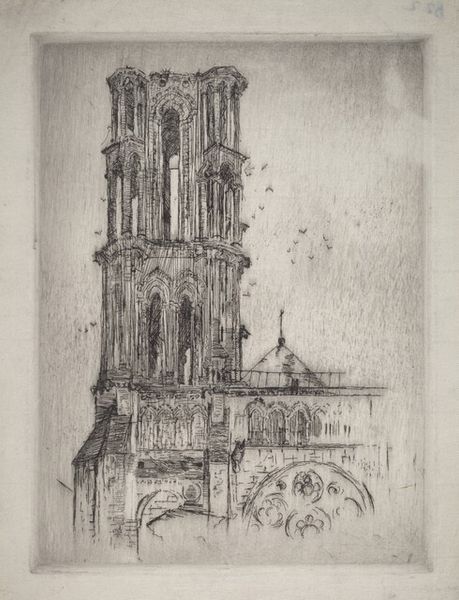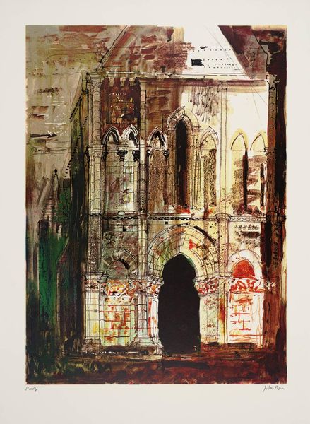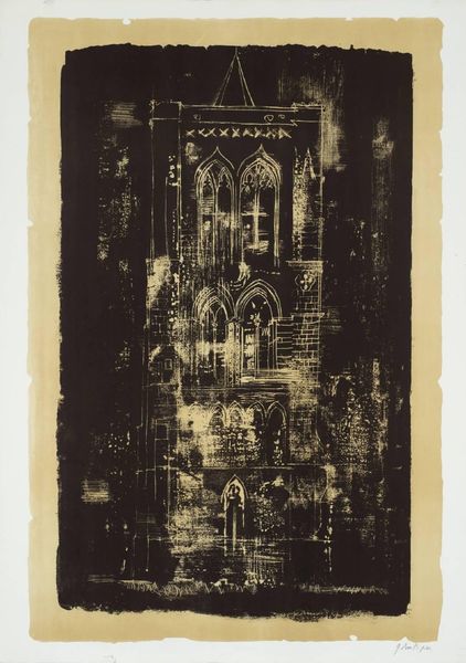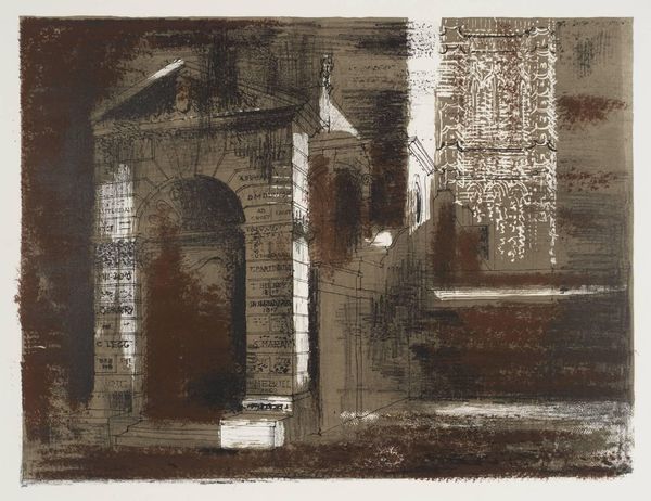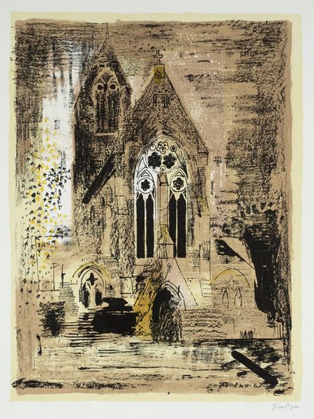 Curator: John Piper’s print, "20. St Anne’s, Limehouse, London," captures Nicholas Hawksmoor’s imposing church with such atmospheric weight. Editor: It has this brooding, almost gothic feel, doesn’t it? The heavy lines and muted tones give it a sense of age, even decay. Curator: Yes, and Piper was fascinated by buildings that had a sense of romantic decay, seeing them as almost living characters. The church, built in the early 18th century, was central to the social fabric of a rapidly growing port area. Editor: I love how he uses the scratchy lines to create textures; you can almost feel the rough stone and the unruly foliage. It's like a memory, filtered through emotion. Curator: Precisely. Piper was interested in evoking a sense of place, of history embedded within the architecture. He transforms St Anne's into something more than just bricks and mortar. Editor: It's a powerful statement on the enduring presence of the past. It makes you wonder about all the lives the church has witnessed.