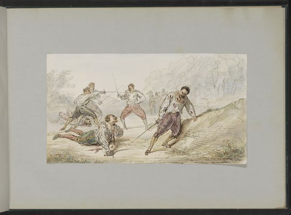 Alexander Ver Huell made this watercolor, titled 'Terugkeer van een gewonde soldaat', which translates to 'Return of a Wounded Soldier'. Painted in the 19th century, the image invokes the complex relationship between the wounded body and constructions of masculinity. The central figure is a soldier, his arm draped over the shoulder of another man for support. Yet, his gaze is downcast, his body weakened, challenging traditional representations of soldiers as stoic heroes. The artist invites us to consider the emotional and physical toll of war. What does it mean to return not in triumph, but in need? Here, vulnerability is on display, a stark departure from idealized portrayals of martial strength. In this disruption of norms, Ver Huell opens a space to recognize a fuller spectrum of human experience.