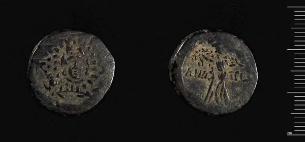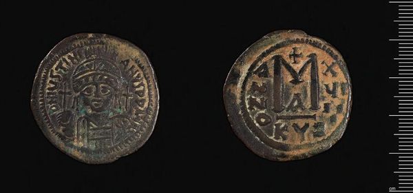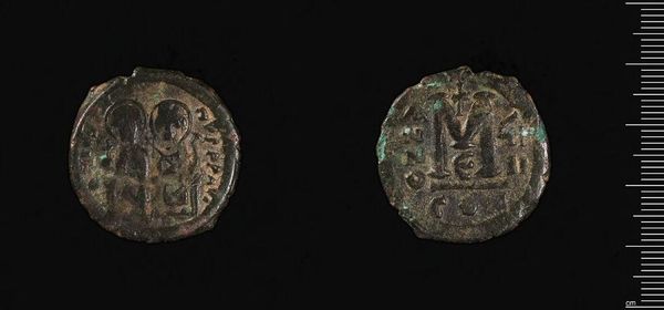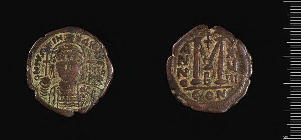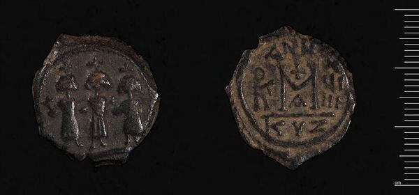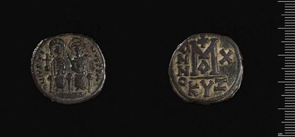 Curator: This is a coin of Herakleios, created by Abd-al-Malik of the Umayyads. Editor: It feels weighted by history, almost like holding time itself. The images, though worn, still suggest power. Curator: Absolutely. The depiction of Herakleios is significant; it represents a visual language of authority, directly referencing Byzantine power structures. This coin's symbolism speaks to cultural continuity and adaptation. Editor: It's fascinating how rulers adopted and adapted iconography to establish legitimacy. But weren't these images initially Christian, then repurposed in a context of Islamic rule? How did the visual rhetoric shift? Curator: Precisely! This appropriation of Christian iconography is a complex maneuver. It's about power, about laying claim. The image still carries echoes of its original religious significance, adding another layer of meaning. Editor: So it becomes a site of intersection, reflecting shifting identities and power dynamics. It really makes you think about representation and control. Curator: It does. It’s a potent reminder of how symbols transcend and transform across time. Editor: A single object becomes a point of departure for an entire history.