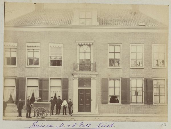 Curator: Well, hello there. It has a quaint feel; something in its aged presentation makes it appear nostalgic and calm. It almost appears like the artist sought to take viewers back to simpler times. Editor: This is "Putberg," an albumen print photograph created around 1900 by Frits Freerks Fontein Fz. The piece offers us a look into a specific spatial context within urban development at the turn of the century. What do you observe? Curator: First thing: the subjects are obscured. Look, three figures sit outside, close to each other. We don't know anything about them. Was the picture planned? Were they wealthy family members? Editor: Those are relevant and necessary questions! Early photographic processes demanded longer exposure times, which might explain why their identities appear more ambiguous and less defined. What happens, however, if we understand the composition of the photo as a statement of its time, understanding that it's made around or after industrialization changed the texture of cities? The people become just one component of an overall changing landscape. Curator: Interesting point. In that light, their obscured presence speaks volumes—or perhaps silences volumes—regarding their personal experiences of the historical forces around them. Like, their "blurriness" captures their experiences and what they witnessed while still not conveying much regarding the nuances. Editor: Precisely. And thinking intersectionally, the absence of vibrant details underscores questions related to privilege, historical access, or simply those people who could afford it. Who is welcome here, as well? Curator: Food for thought, certainly! Considering that it is from around the turn of the century, I feel reflective. If only such scenes from our contemporary moments would be seen by people in the future. Editor: Indeed, a poignant echo through time. Perhaps, future viewers will have even deeper considerations.