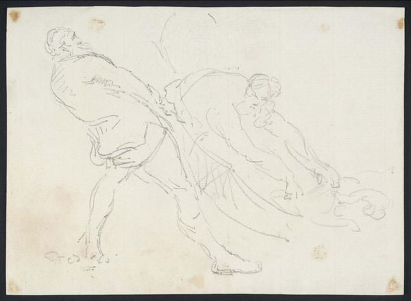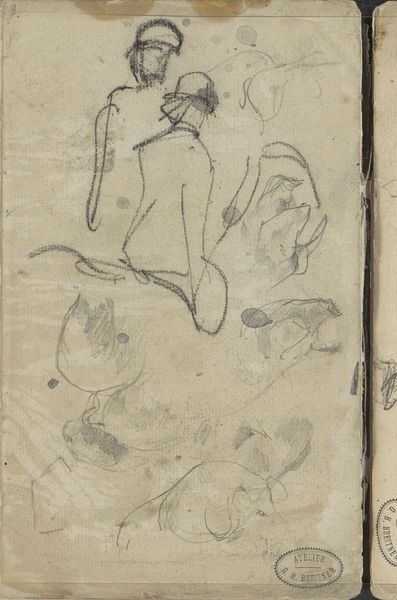 Editor: This is "Malczewski, Wyczółkowski and Axentowicz as fauns," a pencil drawing by Jacek Malczewski from 1902. It's a very quick sketch, almost dreamlike in its ethereality. What leaps out at you when you look at it? Curator: Oh, this! I feel as though I've stumbled upon a playful secret whispered between friends. Do you feel the weight of the chains behind the fauns? Malczewski, perhaps cheekily, presents fellow artists as these mythical beings. Imagine them debating art over flagons of wine! Editor: I do! The chains definitely bring a strange tension into it. But, why fauns, do you think? And what's the significance of portraying other artists this way? Curator: Ah, there you find the mischievous spirit of symbolism afoot. Fauns embody wild freedom and artistic abandon. Malczewski seems to be suggesting something about their shared artistic identity – a liberation from the conventional through their art. The chains could be society, artistic norms… perhaps even self-doubt. Do they seem burdened or liberated to you? Editor: I think liberated... but knowingly. Like they're aware of what they're leaving behind. The sketchiness almost makes them feel fleeting. Curator: Precisely! Fleeting as inspiration, perhaps? It’s less a concrete portrait and more the feeling of shared artistic kinship captured in a fever dream. Does it remind you of any stories, maybe myths you heard growing up? Editor: That's such a great question. I am now getting a sense of Pan's revelry. I hadn't thought of it that way before, but now I'm feeling a lightness about the sketch! Curator: See? Isn’t it delicious how art unlocks new chambers of your own imagination? This playful irreverence is why I love this piece so much! Editor: Absolutely, and that makes a big difference to how I approach the rest of my museum tour now!