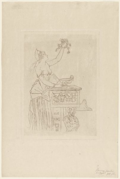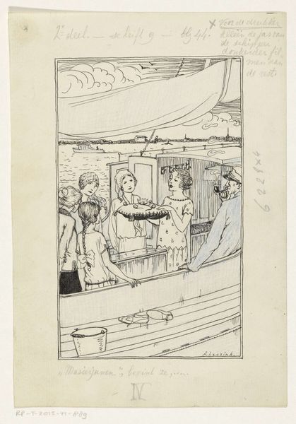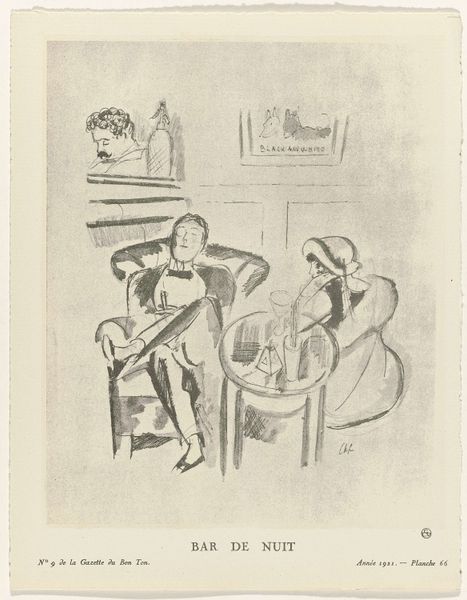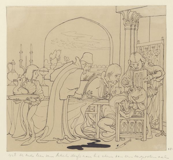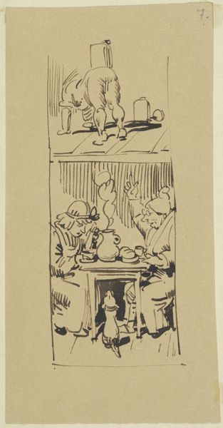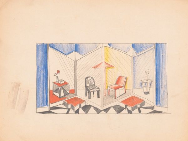 Curator: Osbert Lancaster's "Greenery Yallery" presents a domestic interior, rendered in ink on paper. The support measures roughly 35 by 25 centimeters. Editor: It feels like a stage set, all drawn lines and flat planes. Very theatrical, but also a bit claustrophobic with the busyness of the wallpaper. Curator: Lancaster was known for his satirical cartoons. The excessive ornamentation, the collected plates, speak to a certain social class and its aspirations. The materials would have been readily available and comparatively inexpensive, making mass production easy. Editor: Right, the visual clutter as a signifier of bourgeois taste. And how the print medium itself democratizes art consumption. Are we meant to see the wallpaper as a commentary on industrial design, questioning the boundary between mass production and artistic creation? Curator: Exactly! The labor involved in the production of these objects and their subsequent consumption are all part of the artwork's meaning. Editor: It's a snapshot of a cultural moment, really. Fascinating to consider the social forces at play within something that seems so simple on the surface. Curator: Indeed, and perhaps how our own spaces reflect our values and place in the world.