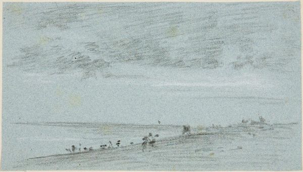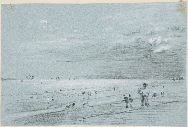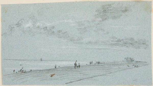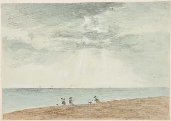 Curator: This sketch, "Figures on the Beach," is in the style of Joseph Mallord William Turner and resides here at the Harvard Art Museums. Editor: It’s so hazy and evocative. The muted tones and indistinct figures almost melt into the sea and sky. Curator: It certainly captures Turner’s interest in atmospheric effects. Consider the social and political context of leisure. Beach scenes like this became increasingly popular as seaside resorts grew in the 19th century. Editor: Yes, and the blurry figures on the beach almost feel like a critique. Are these representations of privileged classes seeking leisure, or are they depictions of the working class seeking solace from labor? Curator: Precisely. The public role of art in this context also involves questioning notions of class, identity, and how societal factors shape these narratives. Editor: It’s a powerful reminder of how art can reflect and refract the socio-political landscape, even in seemingly idyllic scenes. Curator: Indeed, and this sketch, with its historical echoes, speaks volumes about our ongoing conversations around identity and place.