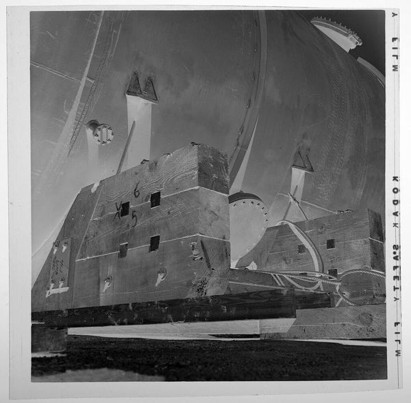 Curator: This intriguing silver gelatin print comes from the Harvard Art Museums. It's an untitled work by Jack Gould, a close-up view of a large tank, measuring only about 5.7 by 5.7 centimeters. Editor: Wow, that tank feels massive and imposing, like some industrial behemoth looming over us. There’s a strange stillness to the image, a kind of quiet intensity. Curator: Indeed. Note the sharp contrasts, the interplay of light and shadow. The composition emphasizes the geometric forms, the rigid structure of both the tank and the wooden supports. The negative space creates a sense of depth, almost a void surrounding these objects. Editor: It makes me think about power, both in terms of physical scale and perhaps the unseen forces these tanks might contain. It's a little unsettling, but also strangely beautiful in its starkness. The wood is a nice contrast to the cold metal. Curator: Precisely. Gould's manipulation of light and form transforms a mundane industrial scene into a study of texture, shape, and the poetics of industrial design. Editor: It's funny how something so seemingly ordinary can become so compelling through the artist’s eye. I see it in a whole new light now.