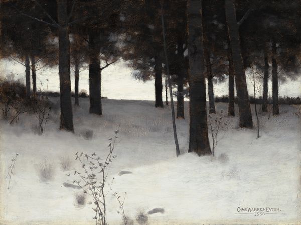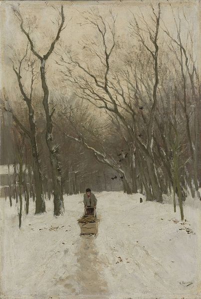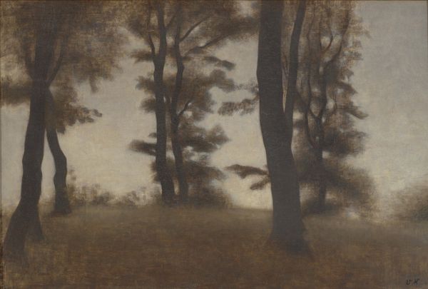 Curator: Vilhelm Hammershøi's "Søndermarken Park in winter," painted around 1895, presents a stark yet beautiful exploration of the natural landscape. The canvas, rendered in oil paint, is predominantly monochrome, capturing the muted tones of a snow-covered park. Editor: Immediately, it evokes a sense of hushed stillness, a sort of solemn quiet. It feels like stepping into a world where sound is absorbed by the snow, leaving only the skeletal silhouettes of trees against a milky sky. Haunting, almost. Curator: The painting demonstrates Hammershøi's interest in atmospheric effects and his restrained use of color. It's fascinating how the limited palette emphasizes texture and the play of light and shadow. He seems less concerned with representation and more focused on evoking a mood. This was created at the beginning of his mature period as an artist, if we consider his broader trajectory of artistic creation. Editor: Absolutely. Look at the branches, they seem to reach out like spectral fingers. There is a loneliness here, but not necessarily an unpleasant one. More like a quiet contemplation. The application of oil gives depth despite the restriction in coloration, while the perspective pushes you inward. Did he use sketches before painting this piece or straight to canvas? Curator: Evidence indicates he experimented with compositional arrangements using photography to consider light, shadow and geometry, aligning his vision to the formal structures. Also worth pointing out, these monochromatic approaches reflected social trends with tastes that emphasized function, minimalist form, and practical considerations which became increasingly visible in middle class lives during this period. Editor: That's really interesting. Thinking about how industrial materials began filtering into the artworld is a concept worth exploring separately... So, circling back: beyond its quiet beauty, do you see anything in the production that aligns the natural and industrial within the context of art? Curator: A critical observation, yes. There's a tension here, this natural landscape rendered with the products of industrial production: pigments manufactured and distributed via complex systems. And its artistic significance—art viewed by elites. Thus Hammershoi’s work invites consideration around artistic, social, and industrial ecologies, and how these pieces get presented, maintained, preserved, or reinterpreted today. Editor: The image invites us to examine how materials shape artistic expressions and how the landscapes are never viewed independently of the culture in which they are produced. As we head off now, it offers an opportunity for self-reflection on how each piece carries the potential to illuminate hidden societal structures.
