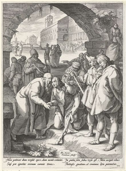 This engraving, *Vrouw met meerdere minnaars*, was made by Adriaen Schoonebeek, likely in the late 17th century. Notice how the scene is constructed, almost like a stage set, with the cobblestone ground acting as the stage floor. The composition draws our eye to the woman at the center, framed by her two suitors. Schoonebeek uses line and form to create a sense of narrative tension. The men’s gestures—one leaning in, the other throwing his arms out—feel performative and theatrical. But what kind of commentary might Schoonebeek be making through this staging? The crisp, precise lines create a sense of order and control, yet the subject matter hints at social disruption. The artist uses the formal structure to explore themes of social satire. This suggests the artwork is not just a depiction of a scene, but an invitation to decode its underlying meanings and societal critiques.