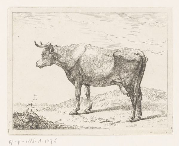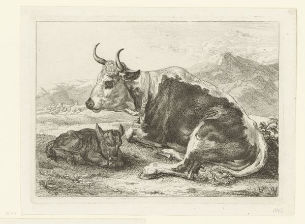 Curator: This delightful drawing, "Liggende ko. Foroven til venstre en siddende bondepige, t.h. en kat drikkende af en mælkebøtte" by Johan Thomas Lundbye, dates to 1843. It combines ink and watercolor on paper, presenting a charming scene. What's your initial response to it? Editor: The immediacy is striking! It feels so informal, more like a sketch from life than a finished painting. It has this aura of bucolic tranquility, a sort of serene rural scene removed from any socioeconomic stresses—idealized, perhaps? Curator: Interesting point! Consider how Lundbye, deeply influenced by Romanticism, often sought to capture the soul of the Danish landscape and its people. Cows in art, particularly in Dutch Golden Age painting, symbolize prosperity and domesticity. In this context, how might that play out? Editor: Well, positioning this artwork within the historical context of 19th-century Denmark, you've got a period of significant agrarian reform. Seeing a rural subject so intimately could be a way to engage with the shift of rural identities in a time of cultural transformation and socioeconomic uncertainty. The inclusion of the farm girl and cat speaks to a hierarchy. Curator: Hierarchy indeed, reflected through a cultural lens of observation! A recumbent cow mirrors timeless images associated with gentle strength and patience—qualities highly valued in agrarian life and throughout folklore in that time. Note how its repose and gentle form elicit feelings of peace and plenty, recurring motifs with links to much older, enduring pagan reverence of nature's bounty. Editor: Exactly. The cat drinking from what appears to be a milk pail might be an interesting reflection on rural domestic labor and the place of animals in the household structure. It also could represent what Michel Foucault would discuss in tandem with docile bodies. Curator: Fascinating observation. But consider the symbols and the more lasting image, its ability to evoke the deep seated respect for the land inherent within its brushstrokes, connecting us across time. I'm drawn to the cross-cultural symbols representing the endless turning of the seasons. Editor: Well, I was trying to unpack a cultural critique of gender and work. Curator: I see the quiet power of tradition mirrored in simple moments in everyday life! This image has such enduring resonance. Editor: A reminder, perhaps, that the political is always personal.