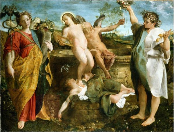 Curator: Here we have Pierre Puvis de Chavannes' "The Sacred Wood Cherished by the Arts and the Muses," created in 1889 using tempera and gouache. It strikes me as an idealized space. What are your initial thoughts? Editor: The pale, muted tones create a sense of tranquility, almost dreamlike. What do you see in this piece? Curator: Well, considering the social context of the late 19th century, this work becomes very interesting. The materiality of the tempera and gouache – often associated with preparatory sketches and craft – elevates the “sacred wood” out of the heavy industrialism of the time. It also challenges the hierarchy of art materials. De Chavannes seems to suggest that spiritual and artistic enrichment wasn’t exclusively the domain of high art, produced with costly materials. Editor: That's a good point! I hadn't considered how the materials themselves play into the meaning. The choice to use these readily available, more accessible media...is he perhaps democratizing the artistic experience, or at least, pointing to where it truly springs from? Curator: Precisely. By depicting the muses amidst these figures, seemingly ordinary in their classical garb and setting, doesn’t he challenge the notion of divine inspiration as something exclusively reserved for the elite? It implies creativity is born from simple, tangible resources accessible to many. How does this relate to labour, materiality and consumption of arts, compared to paintings of the time? Editor: Thinking about production, paintings at the time tried to hide any trace of labour, while "The Sacred Wood" is honest in its technique. The painting favors matte pigments; therefore it does not allow the spectacle of the market, it becomes anti-consumption. I can see this would allow for a more equitable access to arts and its labor... Curator: Yes, this work questions the value system that was being produced and reproduced in academic art practices. It invites us to rethink these relations as well. What will you be taking away from today? Editor: This painting demonstrates how materials and artistic practices, not just subject matter, can carry significant meaning, especially when examined within their specific historical and social contexts. Curator: Indeed. A great starting point to question existing paradigms!