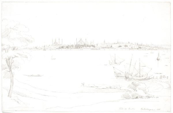 Editor: So, this is "Udsigt fra Gl. Strand over Højbro til Børsen," or "View from Gl. Strand over Højbro to the Exchange," a pencil and ink drawing done in 1845 by Martinus Rørbye. I'm immediately struck by how this quick sketch manages to evoke such a vivid sense of place; it almost feels like a memory being formed. What are your initial impressions of this cityscape? Curator: It whispers of captured moments, doesn’t it? A fleeting breath of Copenhagen life solidified on paper. Rørbye was a master of atmosphere. To me, this isn't just a cityscape; it’s a sensory experience. Notice how the delicate lines of the buildings contrast with the heavier strokes depicting the bridge and the bustling activity along the water? Do you sense that visual rhythm? Editor: I do. It's almost musical, a dance between the rigid architecture and the organic flow of daily life. But what about the starkness of the medium? Why choose pencil and ink over paint for such a vista? Curator: Ah, a delicious question! Perhaps immediacy was key. Pencil and ink allow for speed and precision, ideal for capturing a scene before the light shifts or the moment vanishes. Think of it as Rørbye’s visual shorthand, a way of seizing the soul of the city. The choice also allows us, as viewers, to participate, doesn't it? To fill in the colors, the smells, the sounds...What hues do *you* imagine blanketing this cityscape, looking at it? Editor: Hmm, I'm seeing soft greys and muted browns, a very Nordic palette. Thinking about his intent adds so much to the viewing experience. I see something completely different now! Curator: Exactly! Art invites a conversation, and sometimes, the most rewarding dialogues begin with a simple sketch. I will never think of a pencil drawing as being simple ever again.