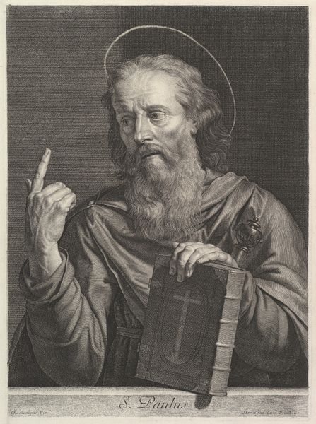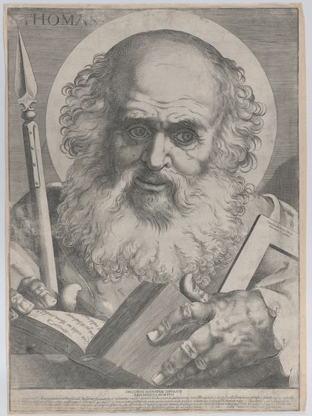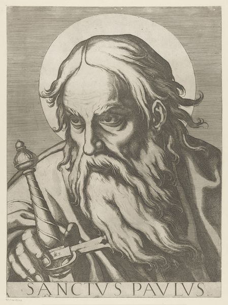 Curator: This is "Heilige Filippus," or "Saint Philip," an engraving by Raffaello Schiaminossi dating back to 1606-1607. It's part of the Rijksmuseum's collection. The print captures Philip in a portrait style, complete with a halo and his symbolic cross. Editor: There's a starkness to this portrait. It feels very direct, even severe. I’m immediately drawn to the detailed rendering of his face and beard, contrasting with the almost hastily sketched drapery. What do you make of the varying textures? Curator: The differing textures likely play into the Baroque era's use of dramatic contrast. Schiaminossi, though not as celebrated as some of his contemporaries, operated within the dominant visual language of the time, emphasizing realism alongside idealized religious imagery. This print would have circulated among collectors and the faithful, reinforcing the saint’s image and associated doctrines. Editor: It’s interesting you mention circulation. As an engraving, its materiality is key—metal plate, the physical labor of etching, the paper it's printed on. The availability of such prints facilitated the spread of not just religious iconography, but artistic techniques and styles as well, no? Curator: Precisely! Consider the socio-political impact of readily available religious imagery at that time. Prints like these shaped the visual culture of both public and private religious life. Schiaminossi and his contemporaries had the unique responsibility of presenting these widely recognized icons. Editor: And considering the tools and the production processes of the early 17th century, it's pretty impressive the level of detail Schiaminossi was able to achieve, don’t you think? Also the impact of producing and then spreading through trade and other exchange channels many copies of this iconic persona, must be really remarkable in cultural terms, even today. Curator: Absolutely. We see how prints influenced religious life, spreading the ideals across Europe. They became tools in both belief and in art itself. Editor: Food for thought, isn't it? It is amazing how much information can be communicated just by analyzing one print!