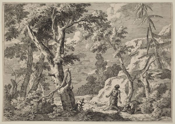Here we see Marco Ricci's "Wilderness Landscape with Two Monks," an etching imbued with symbols of solitude and contemplation. The monks, set against a vast wilderness, evoke a longing for spiritual retreat, a motif resonating through centuries, from the desert fathers to Thoreau's Walden. The towering trees, however, speak to something deeper. These arboreal figures are not mere scenery. Consider their recurrence across cultures – the World Tree of Norse myth, the Bodhi tree under which Buddha attained enlightenment. Trees represent the axis mundi, connecting heaven and earth. Their presence here is a potent symbol of growth, knowledge, and the interconnectedness of all life. The act of solitary study, depicted in one monk, further emphasizes this pursuit of knowledge. It mirrors the enduring human quest for understanding, seen in countless depictions of scholars and hermits across epochs. This image engages us on a primal level, tapping into our collective memory. The wilderness, the monks, the trees, all converge to evoke a sense of introspection, urging us to contemplate our place within the grand tapestry of existence.