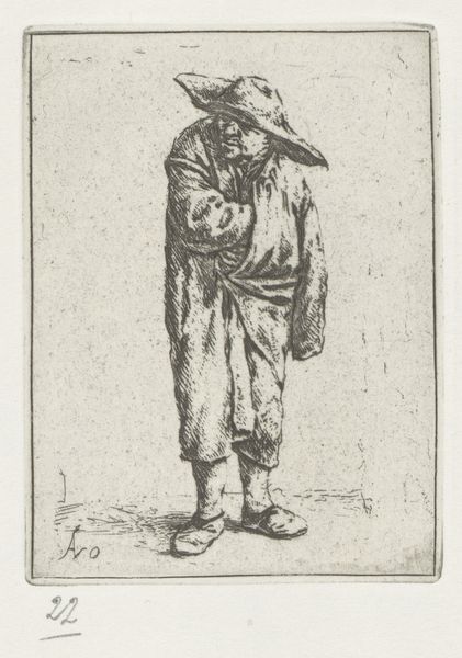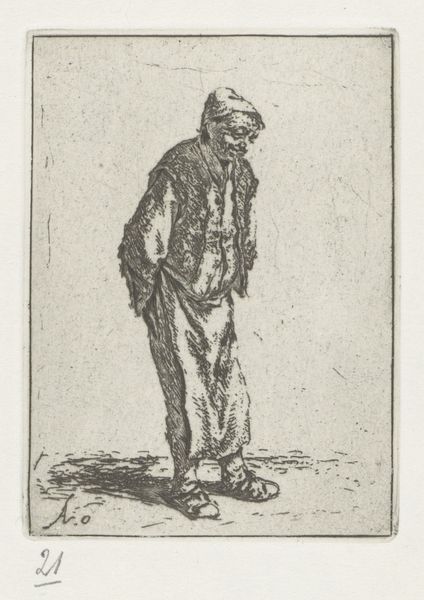 Rembrandt van Rijn etched "The Leper" around 1631, presenting us with a study in stark contrasts and textural complexity. The etching's composition is dominated by the figure's draped form, rendered with a mix of dense, cross-hatched lines and lighter, more open areas. This creates a visual push and pull, drawing our eye across the surface of the print. The leper's attire, a series of folds and textures, signifies both his social marginalization and the physical decay associated with his condition. Note how Rembrandt uses line to define shape and also to convey depth, particularly in the shadowed areas around the figure's feet and face. Rembrandt, through his manipulation of light and shadow, invites us to consider the socio-cultural context of the time, where disease was not merely a medical condition but also a marker of social and moral status. The figure's posture, bent and offering his hand, speaks to a complex negotiation of power and vulnerability. This etching serves not only as an aesthetic object but also as a mirror reflecting broader philosophical inquiries into the human condition. It reminds us that art is not confined to beauty, but it is a medium for grappling with the profound and often uncomfortable aspects of existence.