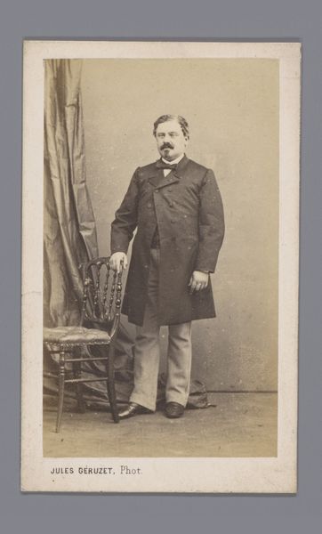 This is a portrait of an unknown man, created by Constantin et Cie. The photograph has a muted, sepia-toned palette, which suggests the image's age and the visual conventions of early photography. The man is depicted in a formal pose, with a distinct verticality established by his upright posture. He is leaning on a decorative chair, which adds to the composition's structured feel. The interplay between light and shadow across the man's face and clothing creates depth, but the shallow focus softens the details, rendering the image more atmospheric than precise. The formal structure of the portrait, with its emphasis on balance and symmetry, reflects the cultural values of the time. The man’s clothing signifies social status, and his pose conveys a sense of self-assuredness. The photograph functions as a signifier of identity, yet the identity remains elusive. The muted tones contribute to a sense of distance, inviting us to consider how such images once served to document and construct individual and social identities. It is a question about meaning, and who has the power to establish meaning.