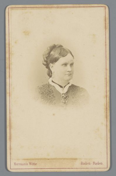 Curator: Looking at this gelatin silver print, "Portret van een vrouw," by Christian Theodor Kirch, dating back to somewhere between 1869 and 1879, I'm immediately struck by its melancholic grace. It feels… intimate. Editor: Intimate, yes, but also formal in that late 19th-century way. Think about the construction of bourgeois identity at this time. It's not just a picture; it’s a carefully curated self-presentation through clothing, posture, and the deliberate choice of photography. Curator: Absolutely, there's a performative element. I'm also pondering her gaze, just off to the side, perhaps at the photographer or perhaps drifting into some other dream, and also considering what sort of a woman she was. The hint of defiance? The pearl earrings peeking out? Maybe she did needlepoint and daydreamed of running away to the circus. Editor: Let’s consider that averted gaze in the context of 19th-century patriarchy. Direct eye contact from a woman could be perceived as challenging or improper. Her gaze is carefully managed. It acknowledges the societal gaze but doesn't necessarily succumb to it completely. Those "circus" dreams likely faced real-world constraints. Curator: Ah, constraints. Yes. This small, delicate picture hints at layers. What we imagine in the quiet spaces. You wonder about her story. She likely dealt with plenty. It’s heavy. A photograph as artifact. The way it connects us to lived experiences that vanished a century or so ago. Editor: Precisely. And understanding those "vanished" experiences necessitates recognizing the complex societal structures at play—gender roles, class divisions, expectations surrounding female virtue and domesticity. A photo like this then becomes a critical text through which we examine the past and consider its lingering impact. Curator: It also reminds you how many unheard stories hide in every photo and, truly, behind every pair of eyes you meet. How many untold tales go unlistened to? Editor: Indeed. Recognizing that silence, acknowledging the unspoken, allows us to critically engage with these historical representations. We need that understanding, I believe. Thank you, Madam.