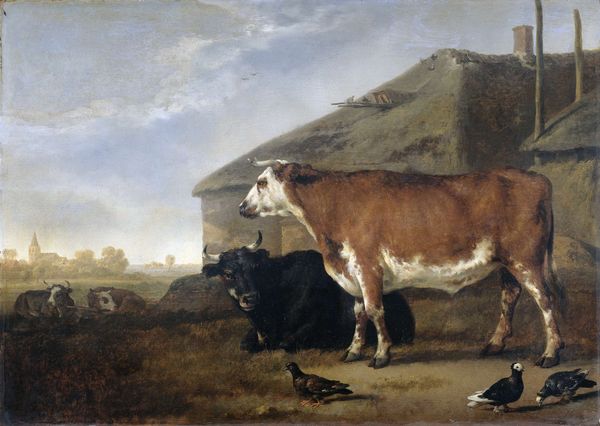 Editor: This is Rosa Bonheur’s “Ploughing Scene,” painted in 1854 using oil paints in a plein-air style. I’m struck by the palpable sense of labor here. It’s a very straightforward depiction of work. What jumps out at you in this piece? Curator: The relationship between human and animal labor is interesting. Do you see the synergy – or perhaps tension – embedded in the image's symbolic vocabulary? The oxen, powerful, muscular, their energy is almost chaotic compared to the steady, rhythmic action of the man guiding the plough. This duality—raw strength versus directed purpose—reflects a common 19th-century understanding of nature tamed. Editor: So, it's about control versus wildness, but also interdependence? Curator: Precisely. Note the haystacks in the background. They are icons of plenty, promise, and agrarian prosperity; all depending on this complex interaction we are observing in the foreground. The symbols here speak to cycles of production, where everything works together: the oxen provide power, the man offers direction, and from the earth comes sustenance. And consider how paintings like this served as potent symbols amid growing industrialization, reminding people of simpler, perhaps more virtuous, rhythms of life. Do you find a sense of idealized labor here? Editor: Yes, definitely, especially given the attention to detail, which elevates this moment into something timeless. The birds scattered in the foreground might hint that this natural cooperation and harmony includes a vast array of nature, beyond the ox and man. Curator: Well observed. In understanding art we must not overlook those quiet reminders that visual language conveys multifaceted narratives and collective memories. Editor: This has opened my eyes to a whole new appreciation for seemingly simple genre painting! Curator: And it also demonstrates the layered meanings a painting like this would evoke, considering the period it was painted in, doesn’t it?