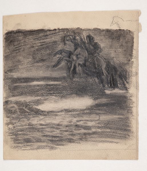 Editor: Here we have "Three Arab Horsemen Crossing a River," a charcoal drawing made around 1835 by Alexandre-Gabriel Decamps. I’m really struck by the muted tones, the somber feeling. It feels almost secretive, like we're witnessing something we shouldn't be. What leaps out at you when you see it? Curator: Secretive, yes, like a hushed memory trying to surface. For me, it’s the light – how Decamps uses it. Notice how the faint shimmer on the water and sky suggests a moon hidden behind clouds. He draws us into this twilight space, doesn’t he? You can almost smell the damp earth and hear the soft splash of hooves. He seems to be less interested in a literal depiction and more with the atmosphere and emotional resonance, wouldn't you agree? Editor: Definitely! It's like he's prioritizing feeling over precision. I read that he's considered an Orientalist painter. Does this fit into that genre, in your opinion? Curator: Absolutely, though with a touch of melancholic Romanticism perhaps. Orientalism in art was often about Europeans imagining and representing the ‘East’. But look closely – is this just an exotic fantasy? Or is Decamps striving for a deeper understanding, using light and shadow to explore themes of journey, crossing borders, perhaps even a hint of longing for the unknown? Or maybe it's about the in-between, that liminal space both geographical and emotional, which many artists try to capture in different eras... What do you think? Editor: That makes me reconsider my initial reading. The 'in-between' is a lovely way to describe it, like the riders are caught between worlds. Curator: Exactly! I initially felt it was very good, now it is absolutely outstanding work, isn’t it? Editor: It is! I came in seeing a somber scene and now I'm leaving with a sense of adventure and possibility. It's amazing how much more there is to discover beneath the surface.