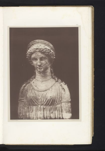 Curator: It has a quiet, mournful beauty. A photograph of a terracotta sculpture… somehow fragile and powerful at the same time. Editor: Indeed. This image, known as "Terracotta Sculpture of Juno or Venus", captures a moment of classical art viewed through the lens of 19th-century photography, predating 1857, by Marcel Gustave Laverdet. Curator: I’m particularly drawn to the figure’s draped garments, the subtle folds and how they cling to the body suggest so much. The rendering has an evocative quality. I wonder about the specific gesture of her raised hand. Editor: Such depictions, Juno or Venus, frequently played with ideals of beauty, womanhood, and divinity within the strict social mores of the time. Its appropriation for photographic study is interesting because of photography’s increasing importance for scholarship and documentation. Curator: Right, it almost becomes an icon of the classical, reproduced and reinterpreted. But the surface of the terracotta is key; it gives that tangible weight. Editor: Absolutely, you are noticing how the interplay between the coolness of the photographic medium and the warmth implied by the terracotta hints to broader questions around cultural preservation and access, it echoes broader debates about authenticity, about art history itself as an authoritative discipline Curator: Thinking about Juno and Venus and how these icons appear again and again. How do we continually engage and transform ancient ideas? The statue seems to say it, this is timelessness materialized Editor: The act of photographing sculptures like this underscores a democratizing impulse—making these cultural touchstones accessible to a wider audience through reproduction, a form of democratization by technology. Curator: In that light, photography isn't just reproduction but cultural participation—we begin to internalize art that way. I see echoes of generations finding something of themselves within these statues. Editor: I think that connection of personal experience to cultural artifacts explains how such images became ingrained within visual literacy and collective imagination. A visual echo felt long afterwards.