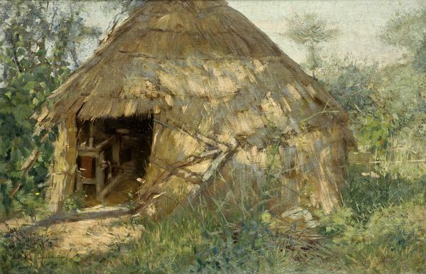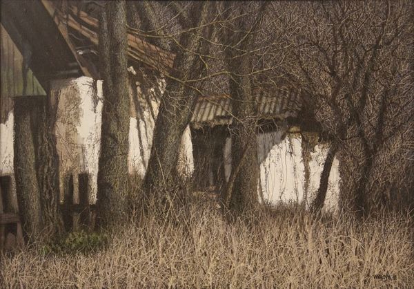 Editor: So, here we have Isaac Levitan's "Old Yard. Plyos." painted in 1890. It's an oil painting and at first glance, I get this really strong feeling of… nostalgia? Like peering into a forgotten corner. What do you see in this piece? Curator: Ah, yes! Nostalgia, certainly. Levitan had such a knack for capturing the soul of the Russian landscape. For me, it's a symphony of greys and greens, wouldn't you agree? That dilapidated architecture…it whispers stories of generations, of lives lived and then faded. Does the artist’s selection of a low vantage point draw you in, pull you towards this decaying beauty? Editor: It does, actually! I feel like I’m walking on that overgrown path. What about the almost claustrophobic feeling with all the structures looming around? Was this a common theme for him? Curator: Yes and no! Levitan often explored the theme of nature reclaiming what's man-made. Notice how the verdant foliage creeps in everywhere, blurring the lines. Yet, even within that perceived confinement, do you spot those glimpses of open sky or verdant grass? He wasn't just showing decay; he was finding the persistent beauty in it, wouldn't you say? And hinting that nature would take its cause, regardless of humans… Editor: That makes sense. So, it's not just a sad picture of ruins, but also kind of… hopeful? Like life goes on. I hadn't thought about it that way! Curator: Precisely. And isn't that the magic of art? To nudge us toward different ways of seeing, isn't it? What would you title the picture, today? Editor: Wow. I learned so much, like seeing how sadness and optimism can mix in one piece. Title… Hmm… "Life Amongst Ruins," maybe? Curator: I love it. The feeling of melancholic reflection with this image will stick with me for some time!