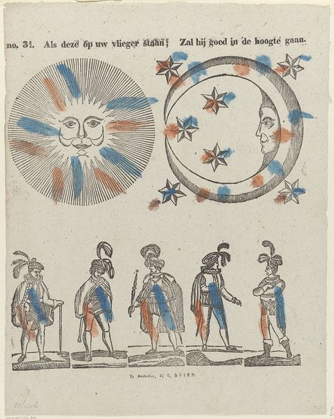 Curator: This whimsical print, created by Lutkie & Cranenburg sometime between 1848 and 1881, is currently held at the Rijksmuseum. It’s a hand-colored print, likely meant for children. What do you make of it? Editor: It’s fascinating! A peculiar blend of suns, moons, and rather stern-looking figures. The hand coloring gives it an oddly homespun, almost craft-like feel. It’s not exactly elegant, is it? Curator: Elegance probably wasn't the goal. These prints were cheap, mass-produced ephemera, widely circulated among children of the time. The rough coloring, almost like a child applied it, points to its role as a playful educational tool. Editor: So the visual roughness is inherent to its very being. It speaks to the conditions of production and consumption, this accessibility through cheapness… like a child's toy churned out in some 19th-century factory. It’s really a mass produced watercolor, the medium isn’t what’s important. Curator: Precisely. The imagery, though seemingly nonsensical, also plays into a larger visual culture. You have these classical figures coexisting with astrological symbols and then acrobats. It speaks to the broad range of imagery available in popular culture during that time. Think about how print became ubiquitous— shaping knowledge of history and fiction and play through images such as this. Editor: It's almost like a collage, isn't it? Different modes and images thrown together. One wonders about the printing process: what kind of workshop produced this? And who were the artisans behind the hand-coloring? Curator: Good questions! We have to think of this as a commercial product embedded within the networks of artisans and distribution channels that would make imagery like this visible in domestic contexts. Editor: Ultimately, I can’t help but wonder at what cost these cheap prints came. What sort of labor and how many hours from start to finish. All for a child’s fleeting joy… a rather potent contradiction embedded in a deceptively simple artifact. Curator: And that’s where its value lies, wouldn’t you say? It’s not just an image but an index of larger historical forces that would reshape both art and society.