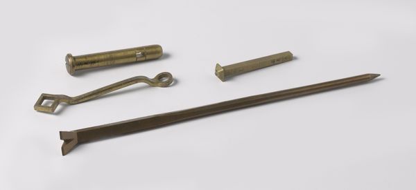 Editor: Here we have "Furniture Hardware" made around 1820 to 1830. The artist is Henry Kellam Hancock. These functional brass and metal elements, now displayed as sculpture, really strike me with their geometric shapes and the warm tones of the brass. What can you tell me about this collection? Curator: I see this collection of hardware as a fascinating commentary on the social context of the early 19th century. The transition from handcrafted to mass-produced goods was well underway, and these brass fixtures occupy a unique place between the two worlds. What processes do you imagine in the creation of each of these pieces? Editor: I guess I envision a skilled artisan, carefully hammering and shaping each element, especially those intricate handles. But how does this collection blur the line between "high art" and "craft?" Curator: Precisely. The labor involved in their creation, the specific skill needed to work with brass, elevates them beyond mere utility. Furthermore, think about the consumption patterns of the time. Owning furniture adorned with such hardware signaled a certain status. Now isolated as art, it urges the question: How has the hardware outlived the furniture it belonged to, and what significance does that impart on our interpretation of its intrinsic value? Editor: That’s interesting. So, we're considering the social implications of production, the labor involved, and how these materials were viewed then, versus how we perceive them today. Curator: Yes. These humble objects offer insights into craftsmanship, consumption, and social status in early 19th-century America. By focusing on these aspects, we begin to dismantle the artificial hierarchy separating art from craft. What new questions does that bring for you? Editor: It makes me think about the value we assign to objects based on their perceived function. Looking closely at their form gives me a completely new perspective on them! Curator: Indeed, examining their materiality helps us understand a society in transition.