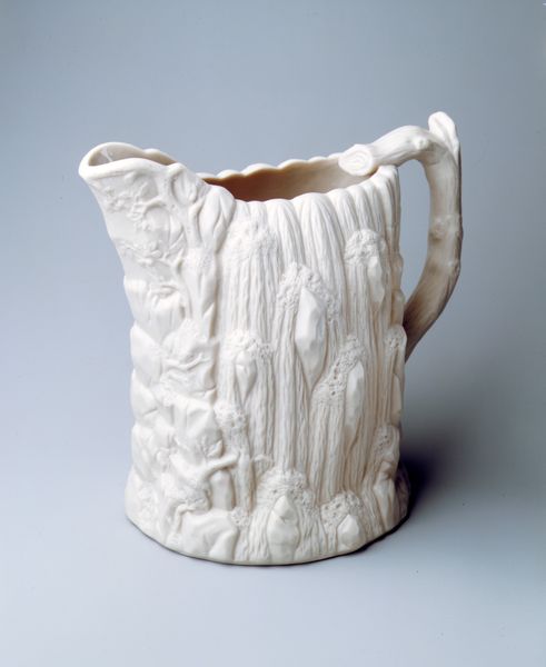 Editor: So, this is a pitcher made by the United States Pottery Company, sometime between 1852 and 1858. It's earthenware with a creamy, white glaze, currently held at The Met. The molded design mimicking woodgrain makes it almost look like a little, petrified tree. How would you interpret a piece like this? Curator: Focusing on the material reality of this piece reveals much about its cultural and historical context. We see an earthenware pitcher striving to imitate the textures and forms of wood. This conscious manipulation of materials prompts questions about the mid-19th century consumer culture. Was it intended for the middle-class home? Editor: That’s an interesting idea – accessible nature for a rising class. Curator: Exactly. Think of the labor involved in creating such a piece. The process wasn't about celebrating the rawness of the earth. This object represents the aspirations, material values, and industrial capabilities of the era. Also, note how this ceramic form mirrors organic structures. Doesn’t that choice also speak about our evolving relationship to nature? Editor: I see your point. It almost hides its own ceramic nature by taking on this other form. I suppose that speaks volumes about shifting values during industrialization. It’s quite interesting, when we focus on the material, how that unfolds! Curator: Precisely. What begins as a quaint decorative object actually provides insights into labor, materiality, and the developing world around it. It certainly encourages you to investigate further. Editor: It does, indeed. Thinking about art in terms of process makes it far more accessible, rather than feeling I need to focus solely on some grand, unachievable intention. Thanks so much for this insightful way of considering the work!