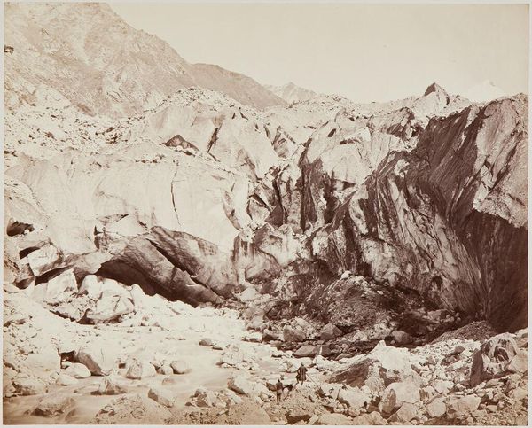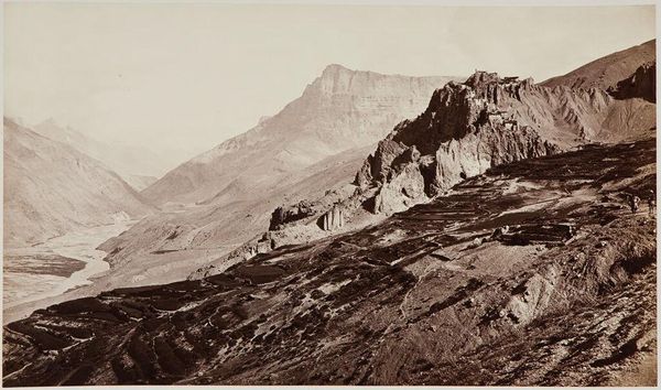 Curator: The vastness captured here by Samuel Bourne is striking; it’s titled "Kulu, Spiti; On the Spiti River, at Kioto, Spiti; Curious Formations" and it's currently held at the Harvard Art Museums. Editor: A monochromatic study of monumental scale! The composition, with its receding planes of mountains and river, conveys a sense of sublime desolation. Curator: Bourne's process involved significant labor, hauling bulky photographic equipment across challenging terrain in the Himalayas. The resulting image would have been a luxury commodity, consumed by a European audience eager for exotic views. Editor: True, and the image itself is a testament to photographic technique. Note the tonal range, and the way the light catches the geological formations. It transforms the landscape into a dramatic vista, full of visual texture. Curator: Absolutely, the materiality of the photograph itself—the paper, the chemicals—speaks to a complex network of production and consumption during the colonial era. Editor: It’s a powerful interplay between light, form, and texture, evoking a feeling of immense, raw power. Curator: Thinking about the historical context certainly deepens my understanding of this image. Editor: Yes, and in isolating these formal qualities, the image speaks beyond its time.
