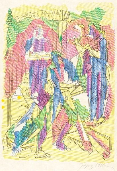 Jacques Villon made this colourful print, Fourth Bucolic: Pollion, using etching and aquatint. The lines feel so spontaneous, like he’s just thinking with the marks, letting the image unfold as he goes. Look at how Villon’s layering color to create depth and form. The planes of blue, yellow, and purple aren’t just decorative; they’re constructing space, pushing and pulling the figures into existence. You can almost see the ghost of Picasso in his work, but Villon is doing his own thing, softening the edges, letting the colors bleed. I keep coming back to the figure on the right, the way the cross hatching on the skirt creates this shimmering effect. The print isn’t trying to be photorealistic; it's about capturing a feeling, an atmosphere. It reminds me of other artists like Francis Picabia, who were similarly invested in this idea of art as a process of discovery. Art isn’t about answers; it’s about the questions.