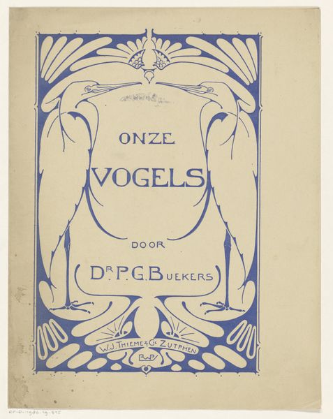 Curator: Reinier Willem Petrus de Vries's "Design for the Lustrum Book of the School of Typography in Utrecht" from 1912, a printed poster really showcases the artist's interest in blending text and image. Editor: It's… understated. That faded violet ink and simple layout give it this gentle, almost shy feeling, as if it’s whispering its message rather than shouting. It invites you in. Curator: Absolutely, that whispers a particular aesthetic choice relevant to the early 20th century. Typography was seen as more than just conveying words but also as an art form integral to modern life. The Art Nouveau influence is fairly obvious, though subdued— you see how those gently swirling letterforms still cling to some ornament without being overwhelming? Editor: I notice how "EERSTE" and "LUSTRUM," those words for "First Jubilee" almost seem to be ghosted in, or emerging slowly from the background. It is as though memory is built directly into its design. What was that printing process like then? Curator: Fascinating thought! Well, printmaking at the time allowed for very controlled layering. Here, De Vries might have used a very light application or even intentionally degraded the printing plate in some sections. Its more than decoration, its about crafting identity, of the design that promotes typography. Editor: And that single purple, or is it a violet hue… I’d say it's regal but in a humble way. Curator: The violet definitely directs us to that period's symbolism! You find the color connected with intellectual thought, contemplation, even a sense of inner wisdom, which of course resonates with the idea of this Typography School jubilee. Editor: There’s also this inherent tension here - the subject itself promotes clarity in communication through typography and print design, and yet it veils and subdues parts of its own announcement. Perhaps De Vries wanted to mirror the act of remembrance in visual terms. Curator: Yes, how striking is that contrast! A work so deliberately about communication with parts almost trying to hide; it feels wonderfully honest, and really emphasizes the feeling of that bygone era! Editor: This makes me consider the nature of academic traditions themselves. How they are ever present while equally elusive or partially faded, until summoned forth once more on occasions such as the one being honored by De Vries in this quiet print.