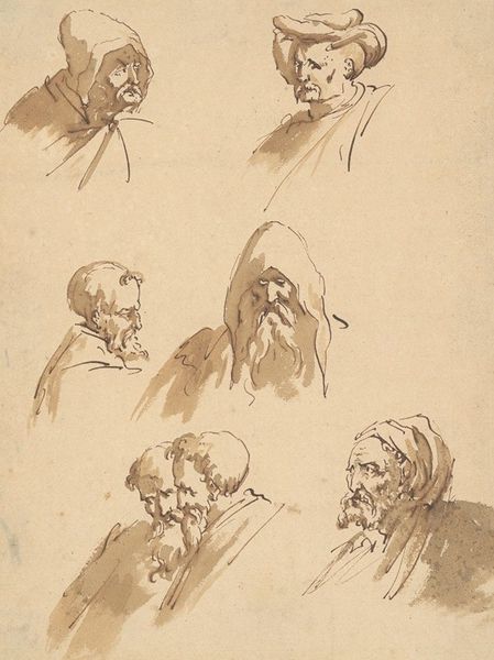 Editor: Right, next up we have "Mannenkoppen en een vrouwenkop" - or "Male Heads and a Female Head" - created in 1839 by Johannes Tavenraat. It's a drawing, made with pencil, and it's currently housed in the Rijksmuseum. It looks like a page torn straight out of a sketchbook! What leaps out to you? Curator: It's that raw energy, isn’t it? The way Tavenraat just lets the lines *breathe*. Look at the helmeted figure—he's not just drawing a soldier; he's exploring a *feeling* of strength, maybe a hint of bravado teetering on the edge of foolishness? You almost want to write a story about them all, don't you? I'm really seeing a theme of "exaggerated features and varied characters." How do you feel it fits in with realism and romanticism? Editor: Absolutely! It’s theatrical but so raw. With realism I think I see the imperfections emphasized... and how about romanticism? Curator: I wonder if it isn't in the *yearning*. See, Romanticism wasn’t just about pretty landscapes; it was about a hunger for something *more*. I imagine Tavenraat sketching furiously by candlelight, wrestling with his own sense of…longing. Think about those lines again: scratchy, searching, not quite resolved. That unresolved-ness…that's the heart of Romanticism for me. And with a bit of realism. A real romance, perhaps? Don’t you think it evokes a feeling of connection to people, to humanity? Editor: Yes! It suddenly feels so alive, like peeking into the artist’s mind as he people-watches! I never considered that pencil lines could "yearn," or at least express it. That helps me understand the art and era that comes after much better too, which makes this sketch particularly thought-provoking! Curator: I agree, these kinds of preliminary character works are very enlightening! Now what sort of stories might you assign these figures based on their expressiveness?