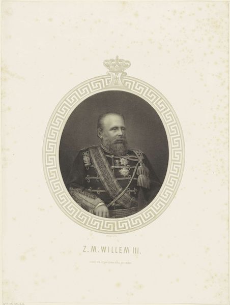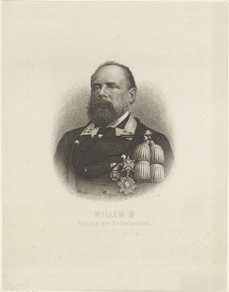 This portrait of Willem III, King of the Netherlands, was made anonymously using lithography, a printmaking technique that relies on the chemical repulsion between oil and water. Lithography democratized image production in the 19th century. Unlike earlier print methods, it allowed for relatively quick and inexpensive reproduction, making images more accessible to a wider audience. In this portrait, the lithographic process captures the King's likeness with remarkable detail, from the intricate embellishments on his uniform to the texture of his beard. The inherent qualities of lithography – its ability to render fine lines and subtle tonal gradations – contribute to the portrait's overall effect of stately authority. This speaks to the politics of consumption, and the implied power and social status of the sitter, reflected in the artistry and craftsmanship of the print itself. Considering the materials and techniques used in its production helps us to appreciate the cultural and social significance of this portrait, challenging any rigid divide between art and craft.