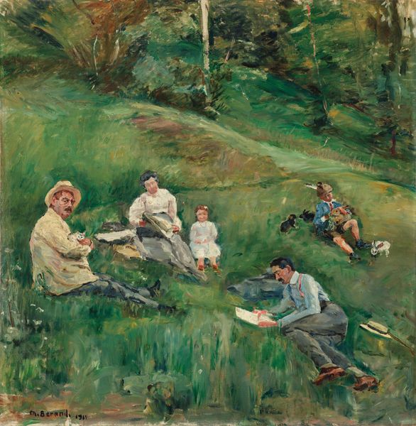 Nikolay Bogdanov-Belsky painted "Playing Children" in 1909, using loose brushstrokes and a warm, earthy palette. The way he's laid down these colors, it's like he's capturing a fleeting moment, a memory half-formed. Artmaking isn't just about copying what you see, it's about feeling your way through it. Looking closer, you can see how the texture builds up, especially in the red of the child's shirt. The paint isn't trying to hide; it's right there on the surface, thick in some spots, thinner in others. There is a gestural energy, a feeling of the artist's hand moving across the canvas, trying to capture the feel of the light and the way the children are absorbed in their play. That patch of green to the right of the children feels like a summary of the whole painting; it could be grass or just a splash of colour, but it hums with possibility. Bogdanov-Belsky reminds me a little of someone like Bonnard, that same interest in everyday life and the way light transforms a scene. But, of course, Bogdanov-Belsky has his own voice, his own way of seeing the world. And that's what art is all about, really – different ways of seeing.