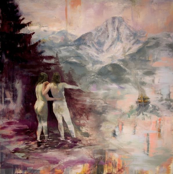Curator: Standing before us is Joshua Flint’s 2016 oil painting, "Mapping a Galaxy." Editor: Wow. It's serene, but deeply unsettling. That misty cityscape looming behind them…gives me chills. Are they about to jump? Curator: Possibly. It evokes the Romanticism of Caspar David Friedrich but tinged with modern anxiety. Observe how Flint contrasts the sharply defined figures with the almost dreamlike haziness of the city in the background. Editor: It's clever. The painting has a surrealist leaning. I think Flint may use the figures as a grounding device—they become observers like us. See how they are situated on this precipice or edge? A point of divergence or possibly convergence. Curator: I agree. The composition emphasizes division—nature versus the constructed world. Yet there's a fluidity implied, isn't there? Almost like an unspoken longing. It speaks volumes about modern life, where progress is always encroaching on something, but without clear destination. It all adds up to something powerful, and unnerving. Editor: I can imagine them poised between eras. That grid is interesting as a pattern to dissect further: the geometry of it. I sense he might have taken pleasure in deconstructing and rendering urban sprawl so clinically and deliberately. Curator: His process involves a mix of photography and historical references. Note the subdued, almost monochrome palette; it invites introspection, asking questions about where we locate ourselves. The oil paints serve it nicely! Editor: Definitely. He layers ideas. His painting style provides us room to wander... it evokes multiple readings and emotions within me all at once. I find that fascinating about modern art and this piece specifically. Curator: Precisely! That’s Flint’s brilliance. Thank you for helping me map this painting. Editor: The pleasure was all mine. An introspective experience.