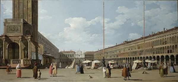 Editor: We’re looking at Canaletto’s "The Piazzetta," painted in 1734. The buildings almost feel like they are tilting inward towards the viewer. What structural elements are most prominent to you? Curator: The manipulation of perspective is critical to decoding Canaletto’s composition. Observe the orthogonal lines of the paving stones; they converge rapidly, creating an accelerated sense of depth. It's almost a stage, wouldn't you agree? The pillars operate as framing devices. The light…notice the subtle gradations, particularly on the buildings, reinforcing the spatial illusion. What do you see in terms of color? Editor: I see how the pillars provide the framing – it seems intentional, now that you point it out. As for color, there’s a definite contrast between the darker, shadowed buildings on the left and the brighter, sunlit buildings on the right, dividing the composition. But how do the figures play into this? They seem almost like an afterthought. Curator: The figures are integral. They are arranged with great care. Notice how they mirror the architectural rhythm; the verticals of their bodies echo the verticality of the columns, the shadows mirroring their mass. Are they simply anecdotal details or structural components? The way they direct our gaze? This isn’t just a record; it is a visual construction. Editor: I see the mirroring now. So, the people and the buildings aren’t separate; they work together to enhance the sense of space and depth within the painting. I guess I missed all of this before! Curator: Precisely! The architecture and the figures are in continuous dialogue; a testament to Canaletto’s sophisticated understanding of spatial organization and his remarkable ability to synthesize disparate elements into a cohesive, structured whole. Editor: That really changed the way I view this piece. I won’t overlook those compositional connections again!
