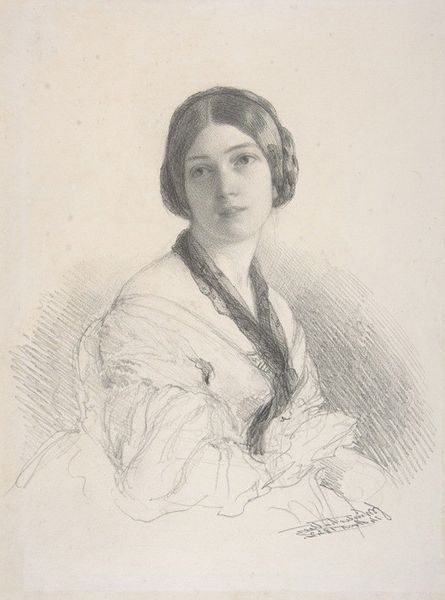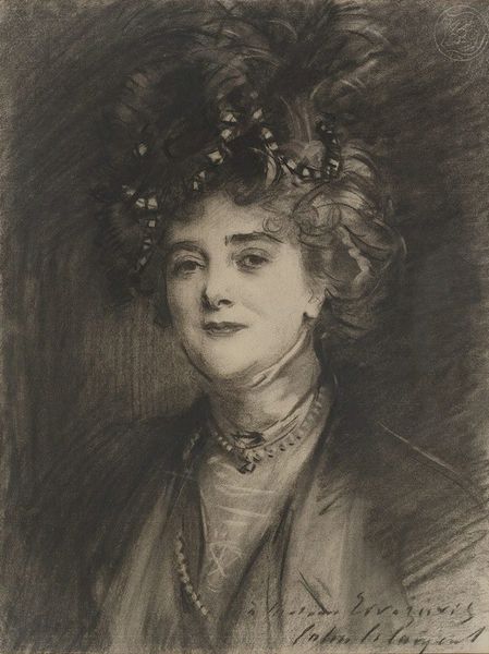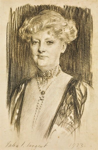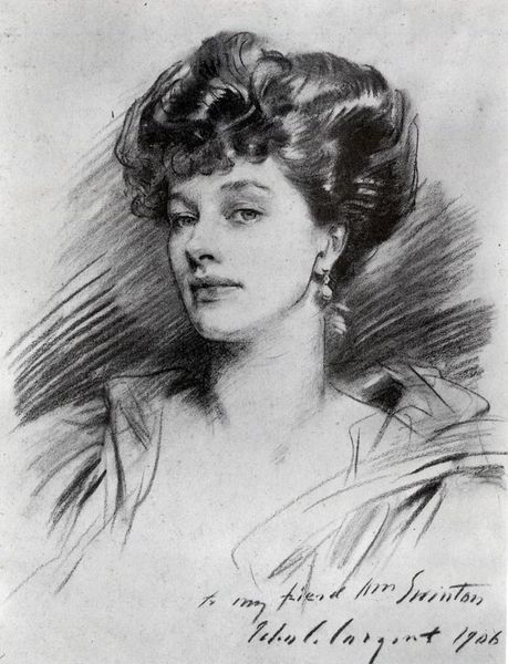 Curator: John Singer Sargent created this captivating drawing of Blanche Marchesi around 1910. It’s currently held in a private collection. My initial response is of profound control and precision—the contrast between the softness of the sitter's features and the definitive lines shaping her structure exudes intent. Editor: The sitter, opera singer Blanche Marchesi, seems burdened by her place in society, trapped between beauty and the performative labor expected of women entertainers. She embodies the complex intersection of fame and the restrictions placed on women's bodies. Curator: Yes, the somber shading expertly defines the features, but for me, this control showcases Sargent's technical command. Notice how the loose sketching of the background sets the formal bust in higher relief, a classical framing tactic. The chiaroscuro isn't just atmospheric; it actively builds her form, light playing over the architectural planes of her face. Editor: The use of charcoal and pencil heightens the contrast between light and dark, perhaps reflecting the public and private personas expected of a performer like Marchesi. The gaze isn’t confrontational, which I think reveals the fatigue of continually performing for an audience’s pleasure. Curator: I concur, and it underscores a calculated use of the medium. Sargent's economical approach captures the sitter's essence. Her interiority manifests from a study of form itself—a dialogue between texture, line, and contrast. The sketch isn't merely representational; it is an abstract play of tonal values carefully orchestrated. Editor: Seeing this piece reminds me of similar issues with artists like Lotte Laserstein in the Weimar Republic—celebrated as “new women” in their fields yet forever labeled, critiqued, and positioned relative to their gender, a societal weight rendering many such women visibly burdened. It prompts a somber appreciation of Marchesi’s cultural contributions but with consideration of the socio-economic demands on performers and female celebrities then and today. Curator: Such interplays and dialogues across epochs of artworks reveal shared techniques, compositional priorities, and stylistic approaches—the underpinnings that sustain our knowledge of visual traditions and continue influencing today’s creatives. Editor: For me, locating these art objects within our ongoing battles for equity reminds me how we carry forward that project. I can continue viewing this piece as more than just a study, an echo of a continuing struggle.