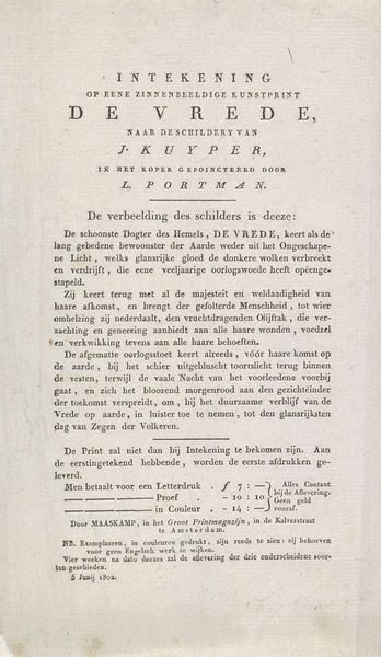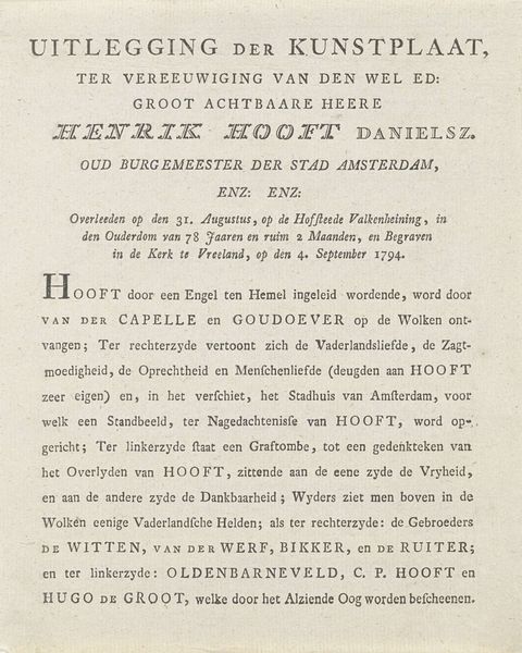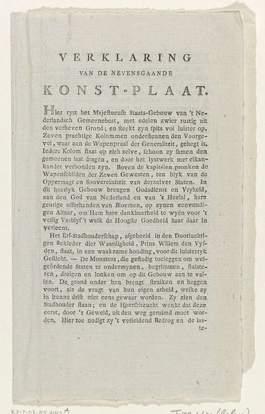 Editor: So, here we have a print from 1763 titled "Verklaring van Amsterdamse kooplieden over het recht gebruik van wissels," attributed to Carel Potgieter. It seems to be a formal declaration, but the handwritten style gives it a personal touch. I’m wondering about the historical context surrounding a document like this; how do we even begin to interpret its cultural significance? Curator: Well, given its focus on commerce and merchants declaring the "right use of bills of exchange," this print gives us a direct glimpse into Amsterdam's economic landscape during the 18th century. These are essentially rules for financial transactions; what strikes me is the need for such a public declaration. What power structures are at play here? Editor: The power of the merchant class, obviously. It sounds like a pretty straightforward commercial agreement, doesn’t it? Was there some instability in financial dealings at the time, leading to a need for public accountability? Curator: Exactly. Think about the role of Amsterdam as a major center for international trade. Documents like these served a vital function. They legitimized trade practices, helped foster confidence among merchants, and cemented Amsterdam's position as a reliable hub for economic exchange. What does that formalized language do, culturally? Editor: It’s almost like an early form of regulation, setting precedents, making financial interactions less risky. But by literally listing merchants and their companies, is it supposed to assure customers or offer security between competitors? Curator: Both! This "Verklaring" embodies the public role of art, even in what we might consider a dry legal document. Its visual form, with listed names giving public weight to the claim, reinforces its function. It speaks volumes about the relationship between art, commerce, and civic life in 18th-century Amsterdam. This has really reframed my understanding of typography at the time. Editor: Absolutely. It highlights how seemingly mundane objects can offer such rich insight into history, specifically in cultural norms of trade practices. I appreciate this deeper dive, highlighting how "art" could serve these official functions in society.