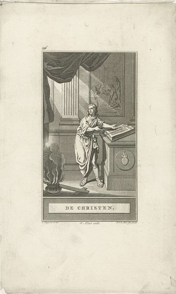 Editor: This print, titled "Tekenkunst," was created between 1777 and 1800 by Noach van der Meer the Younger. It's an engraving depicting a seated woman with art supplies surrounding her. I'm immediately struck by the way she is placed within this almost grandiose architectural setting. What can you tell me about the cultural significance of representing art in this way? Curator: It's fascinating how this piece operates on several historical levels. Firstly, the figure's classical garb and idealized form are a clear nod to Neoclassicism. Do you notice how the "Tekencunst" translates directly to "The Art of Drawing"? The figure represents drawing as the foundation to other artistic disciplines. Editor: Yes, and it's like she embodies a specific role in society. It's more than just a portrait of an artist. Curator: Precisely. We're seeing an ideal being presented by Academic Art. These academies served as arbiters of taste and skill in art training and sought to establish painting as intellectual. How does it accomplish that objective? Editor: Perhaps, showing drawing connected with higher learning as the inscription above her mentions 'felix meritio' [as a result of excellent performance]. Also the inclusion of classical motifs with statues would place 'art' with other noble pursuits. Curator: Indeed, the surrounding sculptures, classical motifs, and the inscription reinforce the association of art with intellectual pursuits and cultural heritage. Art's power lies not just in aesthetics but its perceived ability to civilize and educate. Editor: I see, so the print isn't just a picture; it's making a statement about the role of art itself within society and in art programs during the time. Thanks for helping me dig into the cultural context of this artwork. Curator: Of course. It is a wonderful print, and reveals so much about the institutions that support artistic creation. It's been a pleasure.
