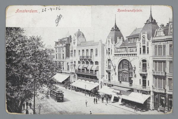 Curator: This gelatin silver print, created sometime between 1890 and 1920, offers a snapshot of Leidscheplein in Amsterdam. Buurman-De Haas, the studio credited, truly captured a slice of everyday life. Editor: Immediately, I’m drawn to the greyscale and the rough, tactile feel that these early photographic printing methods possess. You can almost smell the coal smoke and damp cobblestones. Curator: The image definitely carries that weight. Notice how the placement of the figures seems almost choreographed; their arrangement gives life to the buildings themselves, breathing narrative into a purely architectural scene. Consider the implied stories: Where are these people going? What advertisements draw their attention at the news kiosk? Editor: And how were images such as this made accessible to a broad audience? It must have required dedicated craftspeople creating the photographic paper, tending to the darkroom chemicals... We see the end product, but forget the layered processes to get it into circulation. This object’s context includes workshops, industrial manufacture, and eventually consumption. Curator: True, and let's not overlook the social implications. Who is depicted here? Predominantly, the image signals the emergence of a leisure class in the late 19th century: notice the relatively well-dressed men and women occupying a modern urban center, absorbing printed media. How the camera documents societal changes becomes symbolic. Editor: Right. It serves as material evidence of urbanization, the increasing tempo of modern life. We have architecture constructed from specific materials, new modes of transportation, the emergence of printed advertising—all intersecting at one site through capitalist expansion. Curator: Indeed, a city square imbued with the optimism and perhaps even the anxiety of modernization itself. So much history trapped within this fragile piece of paper! Editor: And now that moment in time and material is ours to revisit. This makes me keen to explore similar street scenes across Europe and assess these dynamics in comparative contexts.