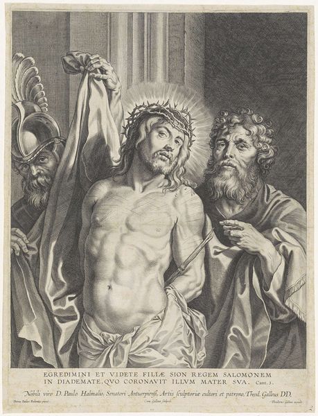 Peter Dannoot created this print, 'Head of Christ with a Crown of Thorns', sometime in the late 17th century. The composition is dominated by Christ’s face, his gaze directed upwards, framed by the sharp angles of the thorns and the soft curves of his hair. Note how the light emanates from behind, casting a glow that accentuates the texture of the skin and the droplets that stream down his face. The formal arrangement invites us to consider the symbolism inherent in each element. The crown of thorns, rendered with meticulous detail, pierces the composition with its harsh reality. The upward gaze suggests a reaching beyond earthly suffering, destabilizing the starkness of the present moment. The use of light, almost theatrical, reinforces a sense of divine drama. Dannoot’s work uses conventional religious motifs to explore themes of suffering, redemption, and the duality of human and divine experience. It's a study in contrasts, challenging us to look beyond the surface and consider the deeper semiotic layers embedded within the artwork's structure.