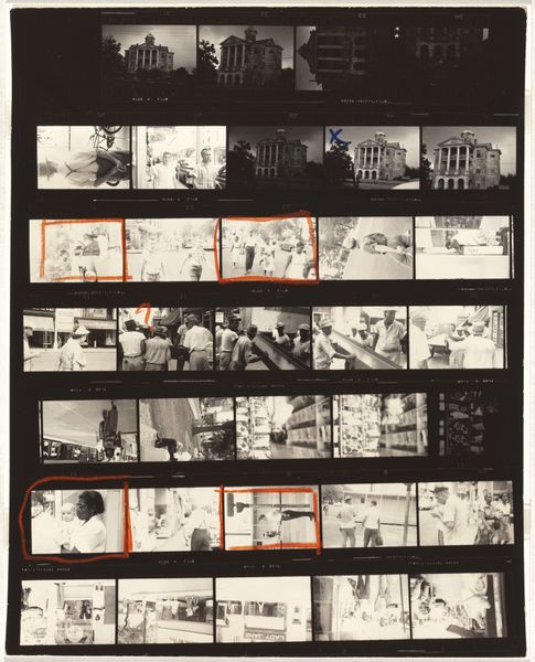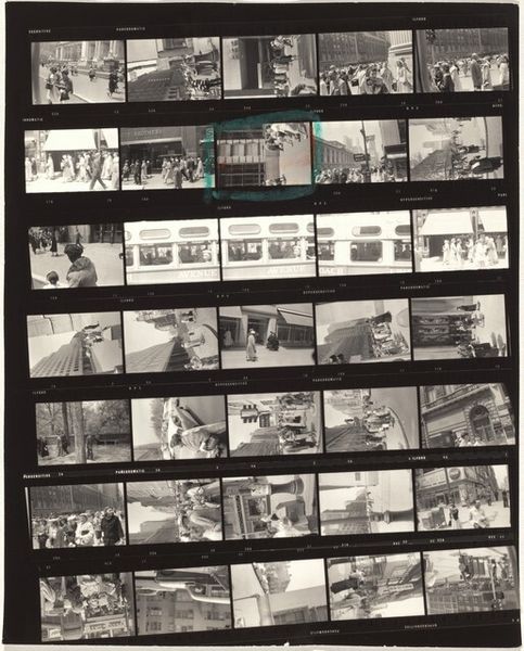 Robert Frank's "Guggenheim 414--Los Angeles" captures a roll of exposed 35mm film, a material exploration in black and white. It is a process-oriented piece, revealing the artist’s eye and working method. The texture of the film itself, with its sprocket holes and edge markings, becomes part of the image. The light catches the surface in different ways. It’s fascinating how the mundane, everyday scenes of Los Angeles are rendered in such a stark, grainy way. In the frame at the top right, you see a beach house repeated. It speaks to repetition and variation, themes that resonate throughout Frank’s oeuvre. Each frame is a unique take, a fleeting glimpse of a place. Frank, known for his raw and unfiltered approach, reminds me a bit of Garry Winogrand. Both photographers were interested in capturing the pulse of American life. With its openness to interpretation, this work invites us to consider the nature of photography itself: a sequence of moments, each one open to interpretation.