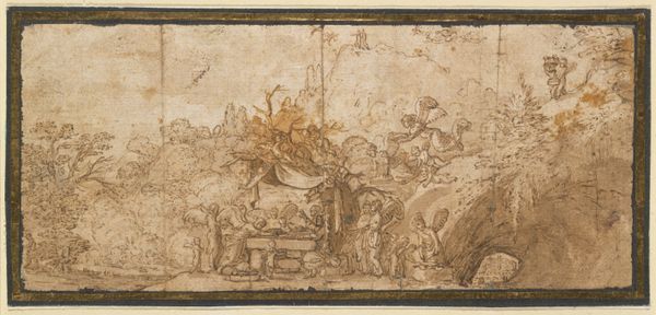 This delicate drawing, "Allegory of Peace," was made with pen and brown ink, likely in the 16th or 17th century by an anonymous artist. The artist used traditional drawing materials to make this image which appears to be a preparatory sketch. Look closely and you'll notice how the ink bleeds slightly into the paper. This quality influences the overall appearance of the artwork, softening the edges of each figure and imbuing the scene with a dreamlike quality. Consider the labor involved in producing the ink itself, from gathering and grinding the materials to mixing the pigment. These traditions highlight the value placed on the material and the artist’s skill in handling them. Even in its unfinished state, the artist's skilled hand brings the allegory to life. By acknowledging the labor, materials and context, we gain a richer understanding of the artist’s intent and the artwork's place in a much wider creative practice.
