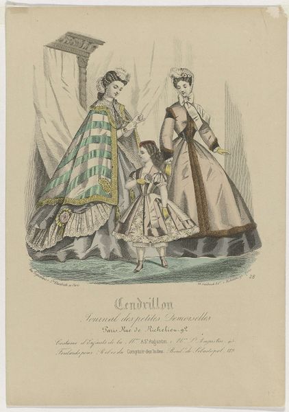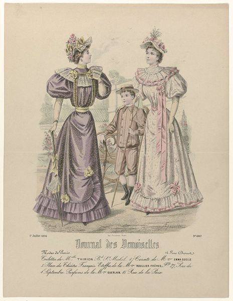 P. Deferneville created this fashion plate titled 'Journal des Demoiselles' in 1894, employing lithography with hand coloring. Visually, the composition centers on three figures – two women and a girl – adorned in the latest fashions, set against a muted seaside backdrop. The artist's use of line and color here serves less to represent reality and more to construct an idealized image. Deferneville masterfully uses color to distinguish textures and materials. Notice how the subdued palette, dominated by pastel shades, reinforces a sense of refined elegance, typical of the period's fashion illustration. Through its formal elements, this piece provides insights into late 19th-century aesthetics and social values. The emphasis on ornamentation and the deliberate arrangement of the figures suggest a world where appearance and presentation play a central role. These fashion plates, like semiotic systems, convey cultural codes, reflecting and shaping contemporary ideals of beauty, class, and femininity.