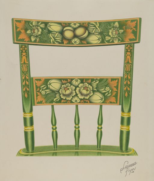 Curator: Let's delve into this preparatory study from around 1936, a piece entitled "Design on Back of Hitchcock Chair" by Lawrence Flynn. It's a vibrant exploration rendered in pencil and coloured pencil on paper. Editor: Well, the first thing that strikes me is how meticulously rendered it is. Almost reverential. You could practically reach out and pluck those… are those eggs? Curator: Indeed. The work speaks to broader questions about the commodification of everyday objects within the decorative arts and their relation to ideas about domesticity, consumption and, dare I say, nostalgia. Editor: Nostalgia, definitely. There’s something deeply comforting about this image – a feeling of being in grandma's cozy kitchen maybe. The arrangement of the eggs and fruit feels almost like a still life you’d see in a Dutch Golden Age painting, just transferred onto something you sit on. A very democratic impulse at work, don't you think? Curator: I think it's about aspiration and class. Chairs, like this Hitchcock design, become signifiers of bourgeois values accessible to a broader public. This drawing is important because it exposes this tension between mass-produced and uniquely-crafted art. It also suggests the politics embedded in something as ordinary as furniture. Who gets to rest, and on what terms? Editor: Mmm, I’m getting ideas now for an installation that critiques disposable culture. Like taking all these chairs and repurposing them as a massive sculpture… anyway, I appreciate your deconstruction here, as always! Curator: Thank you! It's been fascinating to consider the various interpretations held within a design study for a humble chair. Editor: Absolutely. A chair’s just a chair, unless you really *look*, you know? Until next time!
