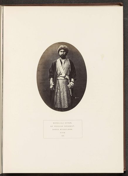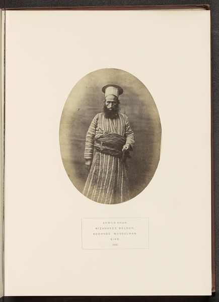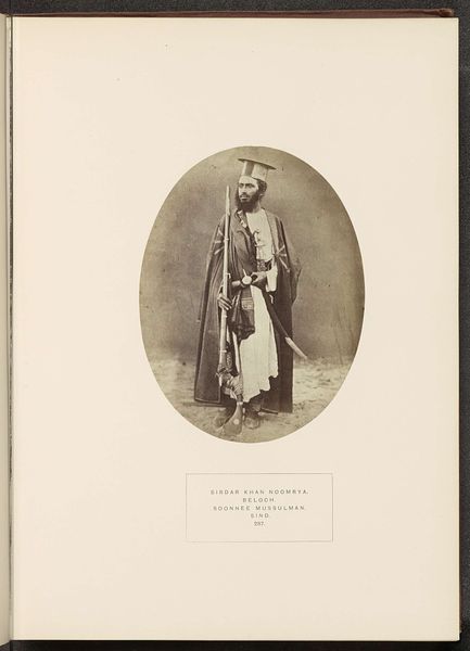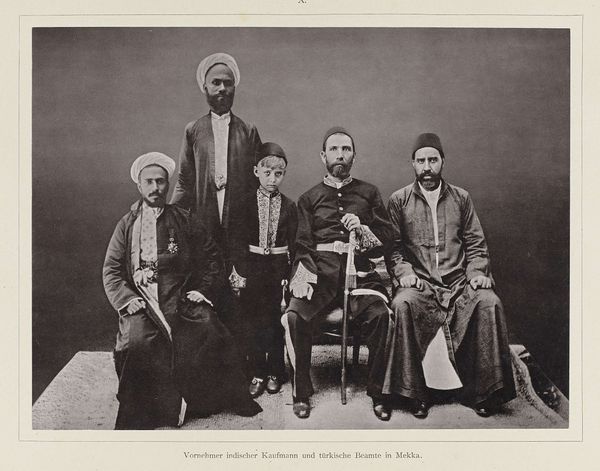 Editor: This photographic print from before 1888 presents four portraits attributed to Christiaan Snouck Hurgronje, showcasing Abd al-Ghaffar, his son, children from the Banī Shaybah tribe, and a sayyid. The composition strikes me with its stark arrangement – a grid of faces, each holding a quiet dignity. How would you interpret this arrangement and the visual elements presented? Curator: Indeed. Considering a formalist perspective, one must observe how the photographer utilises the structure to construct meaning. Notice the recurring motif of seated figures juxtaposed with standing children; this visual rhythm establishes a comparative dynamic. The limited tonal range, from light pencil work to desaturated colours, draws attention to texture and form, enhancing the overall composition through subtle nuances. Have you also considered the semiotic implications of their attire? Editor: Not initially, but I see how their clothing – the turbans, robes – convey status and identity. Do you think the composition directs our eye in a certain way? Curator: Precisely. The photographer uses the frame to draw attention, and the eye traces each face, examining the meticulous arrangement and symmetry of form. Note how the limited light exposure directs viewers towards specific compositional elements: the folds of their garments, the umbrellas… what might these details signify formally? Editor: Perhaps, they provide contrast and visual anchors amidst the muted palette, contributing depth? It’s interesting to observe these purely aesthetic relationships. I initially looked for cultural narratives, but now I better appreciate how the artist used form to construct the image itself. Curator: Indeed, recognizing these fundamental forms enhances one’s appreciation of this arrangement as an intentional aesthetic object.