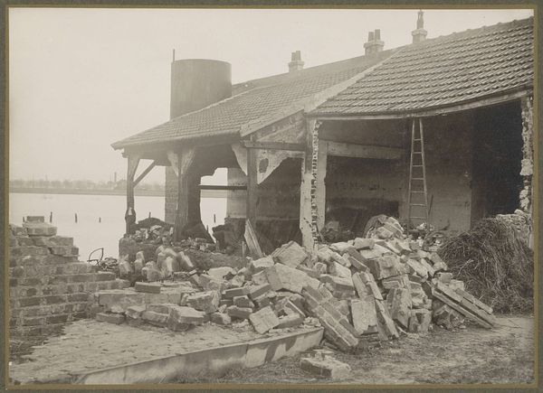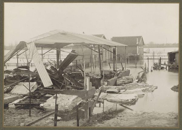 This photograph, *Verwoest fabriekje of werkplaats in een ondergelopen buitenwijk van Parijs*, meaning "Devastated factory or workshop in a flooded suburb of Paris," presents a scene rendered in soft greys. It's as if the world is muted, reflecting a moment of quiet destruction. The texture here is so palpable, you can almost feel the splintered wood and the slickness of the floodwater. It's how the light catches the debris that really grabs me. Notice the way the timbers criss-cross in the lower left. It makes you think about what humans build and how easily nature can reclaim it. There's a strange beauty in the chaos, a melancholic poetry. It reminds me of some of the stark, post-industrial landscapes Edward Burtynsky photographs, documenting the impact of industry, but here, it's on a much more intimate, almost domestic scale. The photograph invites us to consider the narratives of loss and resilience, and the transient nature of human endeavors.