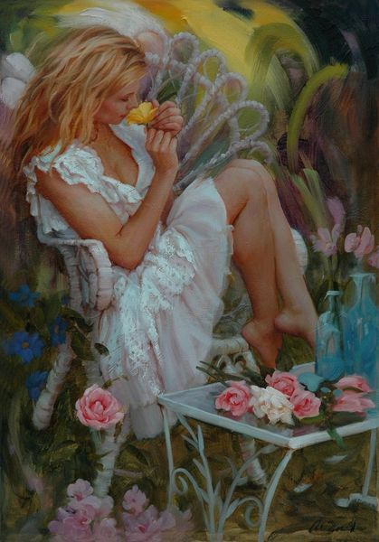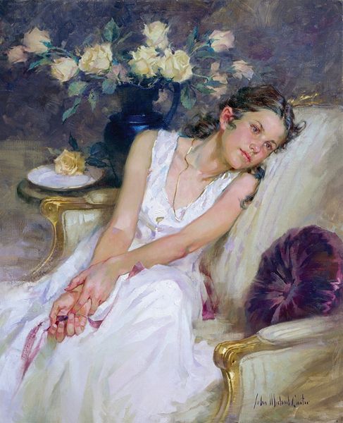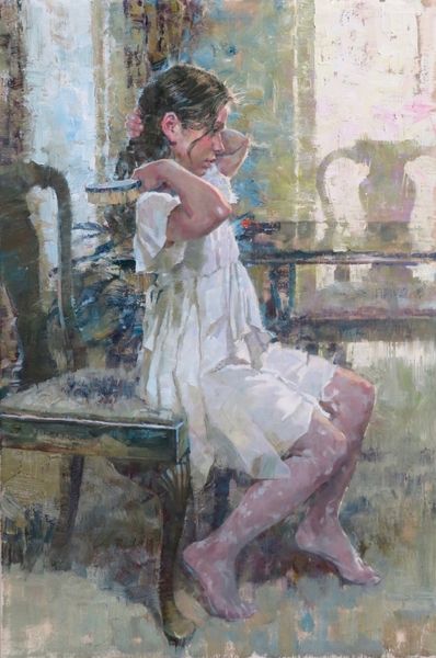John Michael Carter's painting invites us into a tranquil, intimate scene where a woman adjusts her hair, enveloped in a vibrant kimono, with a Siamese cat observing beside her. The cat, revered in ancient Siam for guarding temples and accompanying royalty, emerges as a symbol of protection and domesticity. The kimono, richly patterned, echoes global exchanges and far-flung cultural influences, reminiscent of motifs found in ancient textiles from the Silk Road. The composition, with the figure centrally placed, recalls classical portraits, yet the informal gesture of arranging her hair suggests a modern sensibility. This intimate act connects to age-old rituals of grooming and presentation, found across cultures, reflecting our shared human desire for self-expression. Like figures in a dream, this image engages us, stirring something deeply rooted within, where personal and collective memories converge. It reminds us that cultural symbols are not static, but continuously evolve, carrying echoes of the past into our present experiences.