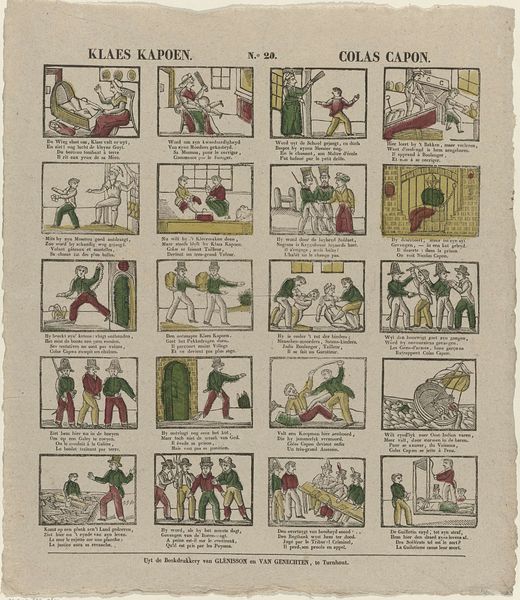 This lithograph, entitled "Wintervermaken" by Lutkie & Cranenburg, presents a grid of vignettes, each a miniature stage for winter activities. The composition, tightly packed and orderly, directs our eyes across a landscape of frozen delight, evoking a sense of communal engagement. The palette is muted, with pale blues, reds, and yellows delicately applied, creating a quaint and innocent atmosphere. Each scene, framed by thin, dark lines, captures moments of play and work on ice. The artists have employed a visual language that balances detail with simplicity, emphasizing the gestures and expressions of the figures. The artwork, beyond its charming depiction of winter pastimes, functions as a cultural document. It presents a structured view of society, framed through the lens of seasonal recreation. "Wintervermaken" offers not just a picture of play but also an ordered representation of social life.